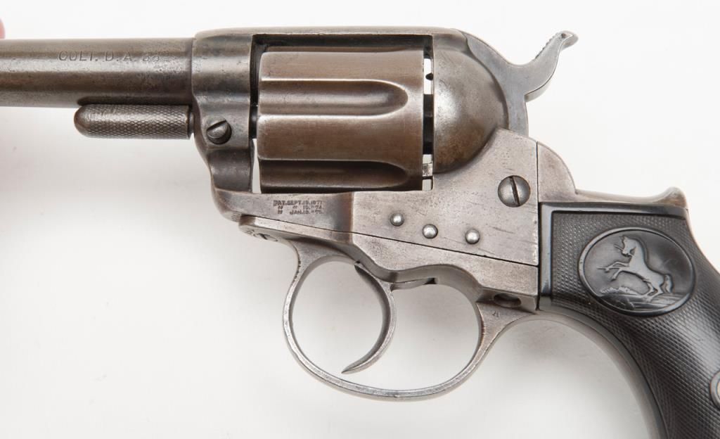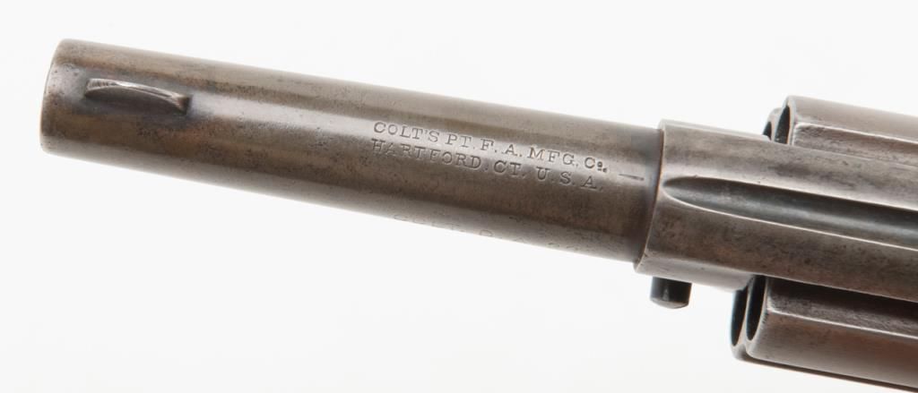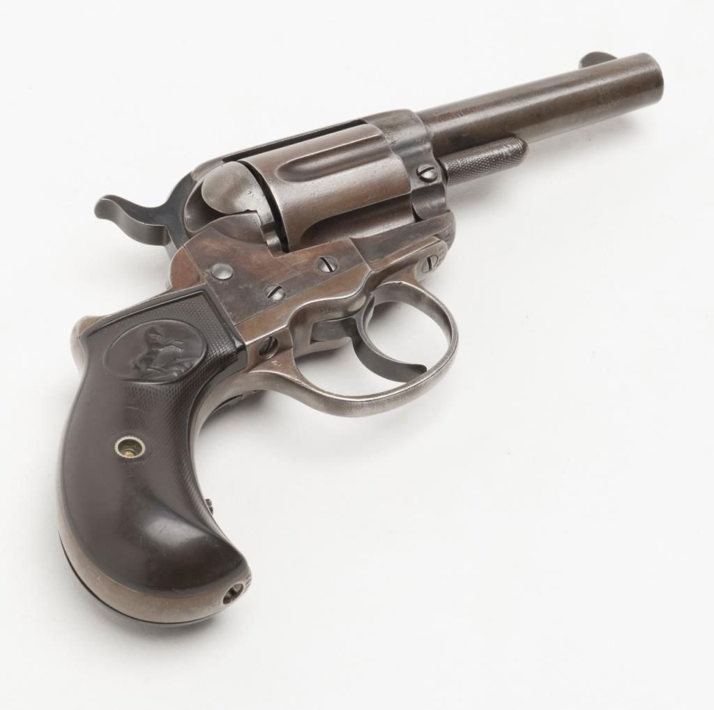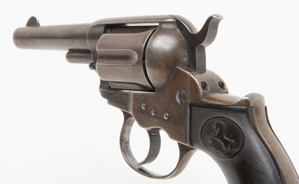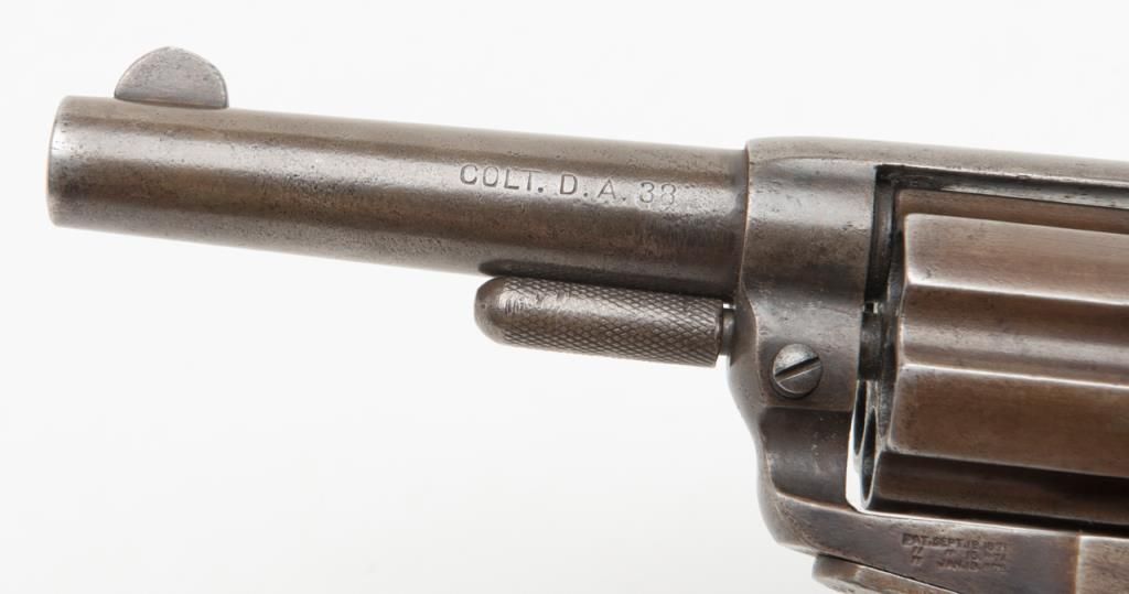 Colt Model 1877 DA ejectorless revolver, .38 cal., 3-1/2” barrel, blue and case hardened finish, hard rubber grips, #64152 in overall good condition showing a dark patina, working action at time of description, good markings, worn butcomplete grips. (Antique). Est.: $250-$450.
