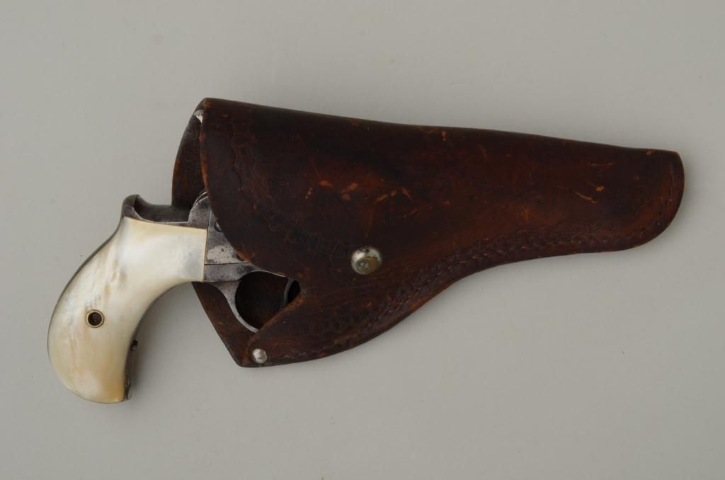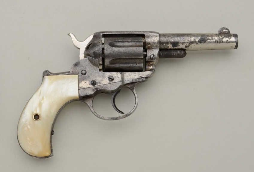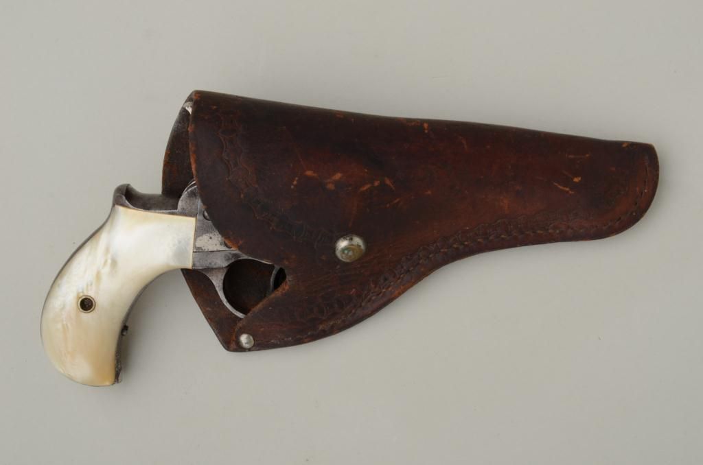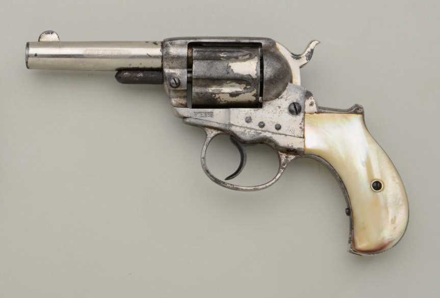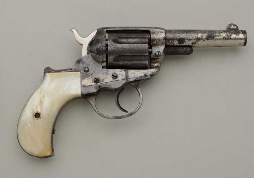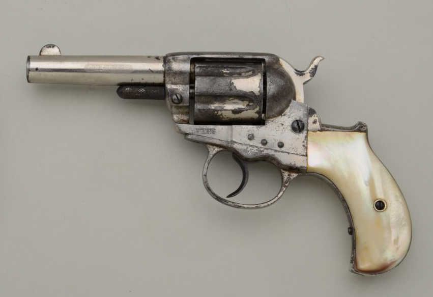 Colt Model 1877 DA ejectorless revolver, .38 cal., 3-1/2” etched panel barrel, nickel finish, pearl grips, #40465 with stock tooled leather holster. This gun is in overall good to very good condition showing approx. 30%original finish with majority of etched panel visible, good action at time of description, good markings, dark bore, very good beautifully iridescent period pearl grips; holster is overall good with decorativetooled border. Est.: $600-$1,200.
