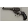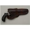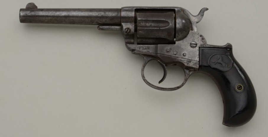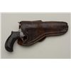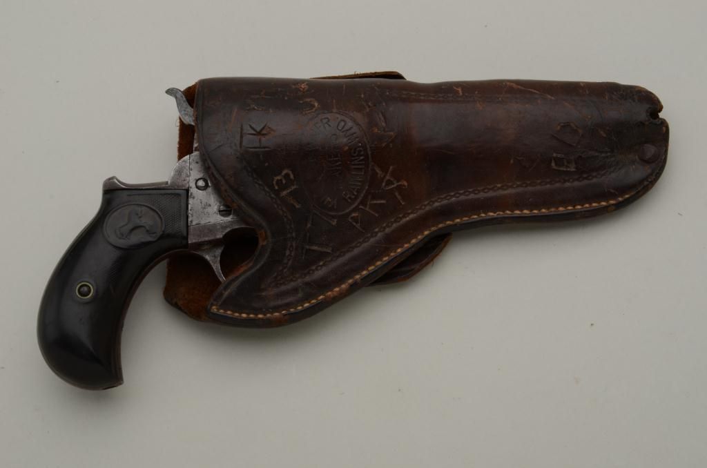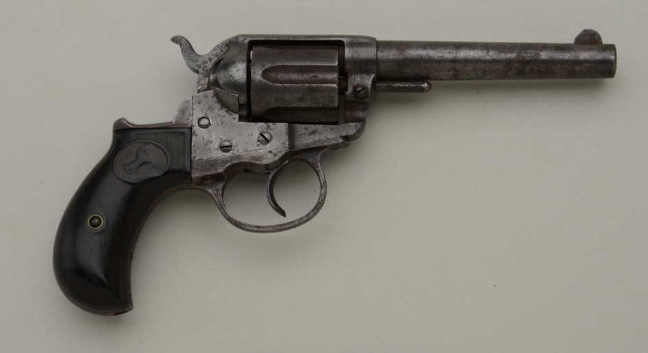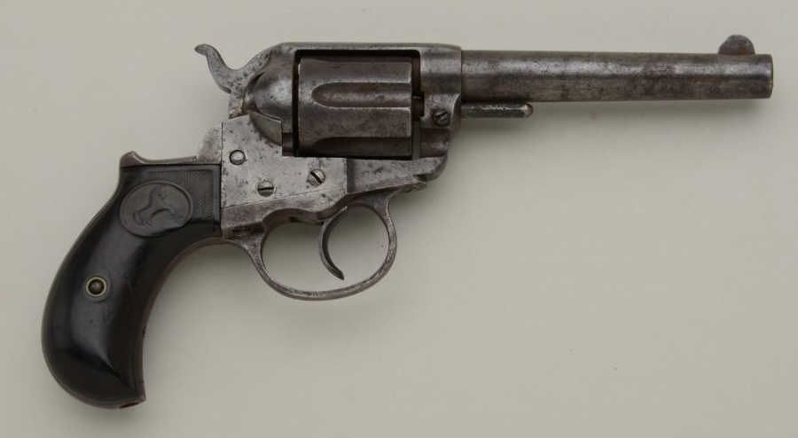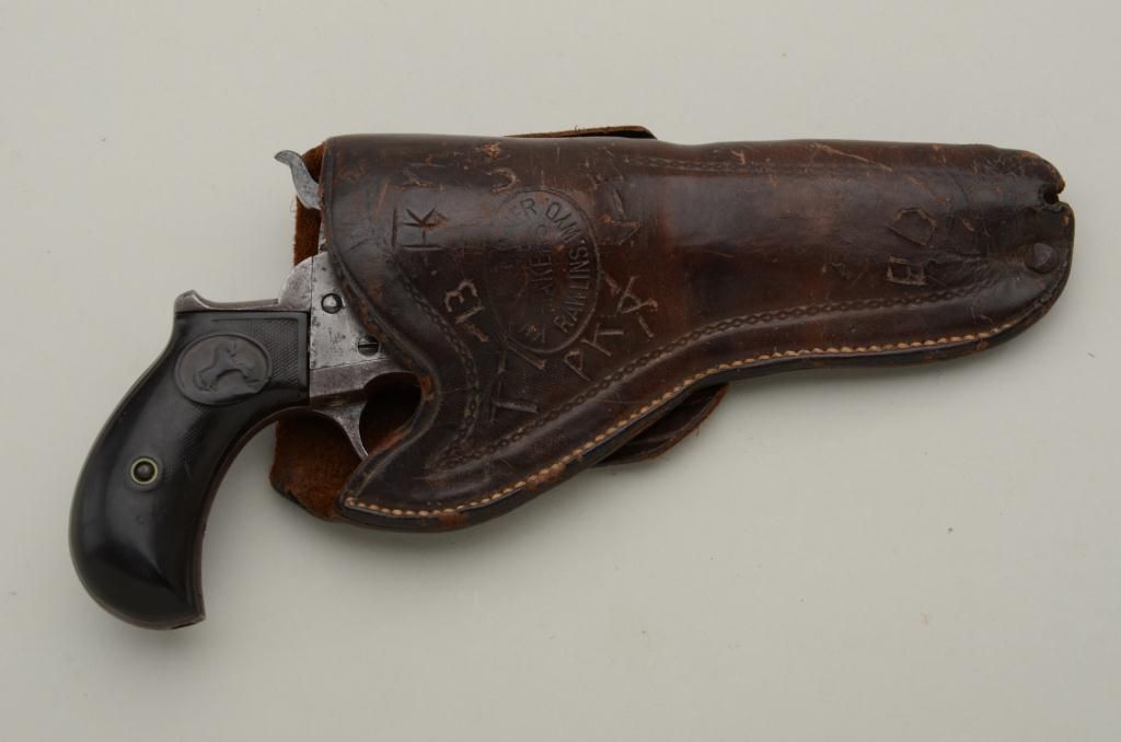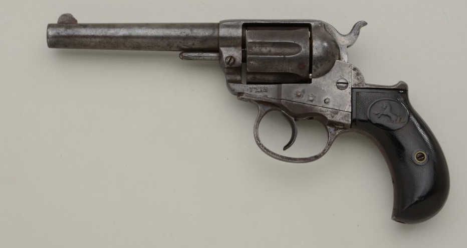 Colt Model 1877 DA ejectorless revolver, .38 cal., 4-1/4” barrel, checkered hard rubber grips, #57006, accompanied by a great Knox & Tanner, MAKER, Rawlins, Wyo.-marked holster with old carved cattle brands. This gun is in overall fair condition showing a brown patina on metal surfaces with scattered erosion, matching visible serial numbers, replaced cylinder pin, action is partially working at time of description but does notstay on full cock and the trigger return spring is not working; the grips are worn but complete; the holster is, as mentioned previously, a highly desirable Knox & Tanner and in classic well-worn condition with lower half of back skirt cut off years ago; would be interesting to research the cattle brands carved in the holster as they are likely spreads around the Rawlins area. Est.: $1,000-$2,000.