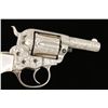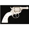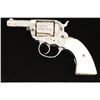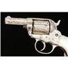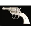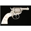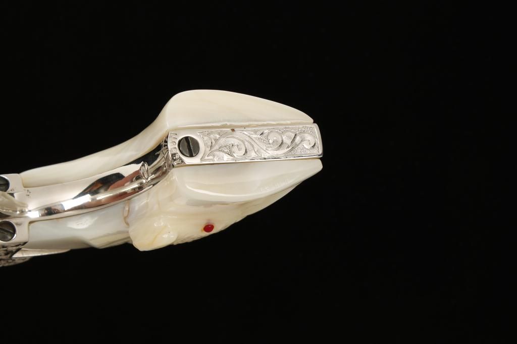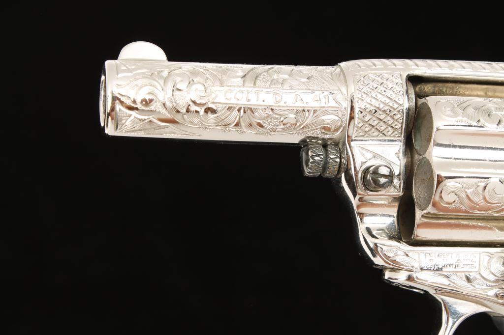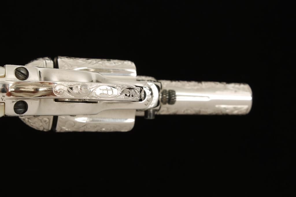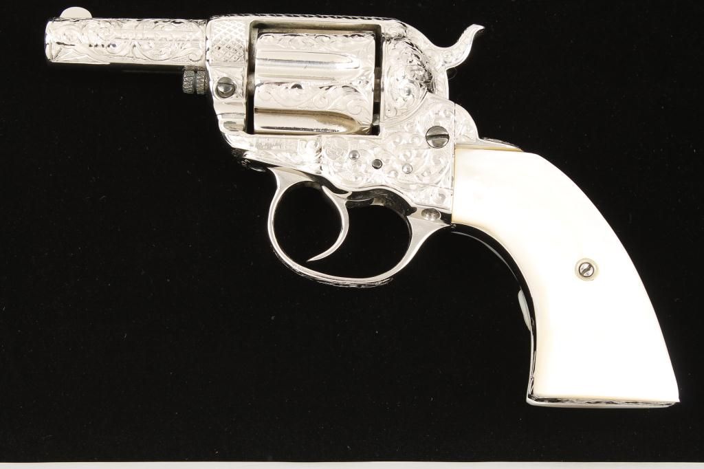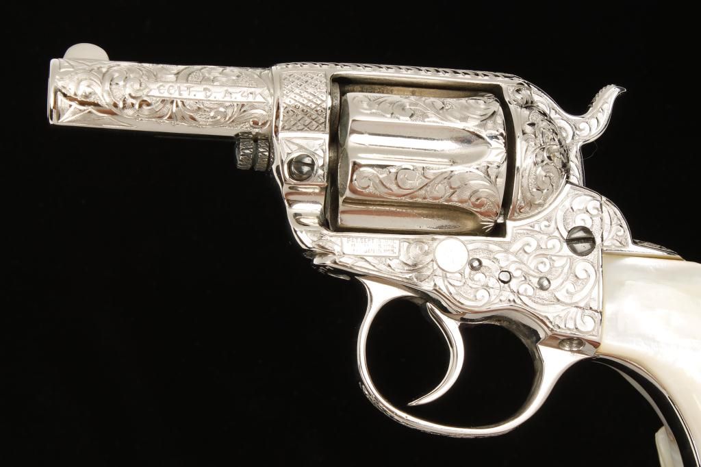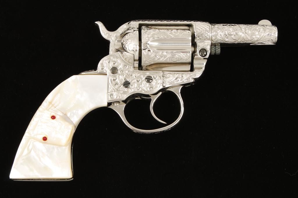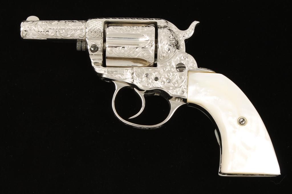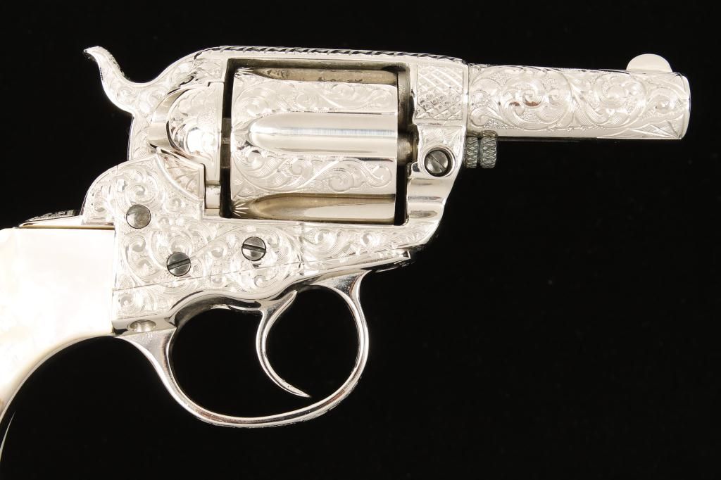 Colt Model 1877 DA ejectorless revolver, .41 cal., 2-1/2” barrel, nickel finish, fully and finely custom engraved, raised carved steer head pearl grips, #125977. This gun is beautifully engraved in the New York style of the late 1800’s with coverage on the frame, barrel, cylinder, trigger guard, backstrap and hammer; the action is good at time of description, the bore is fair and the grips are carved in the classic Western longhornsteer style with red inlaid eyes. From the Texas collection of Eddie Glover, Jr. Est.: $1,250-$2,500.