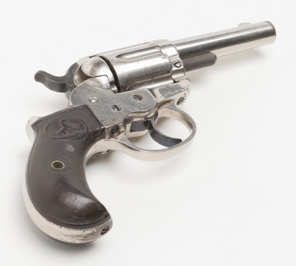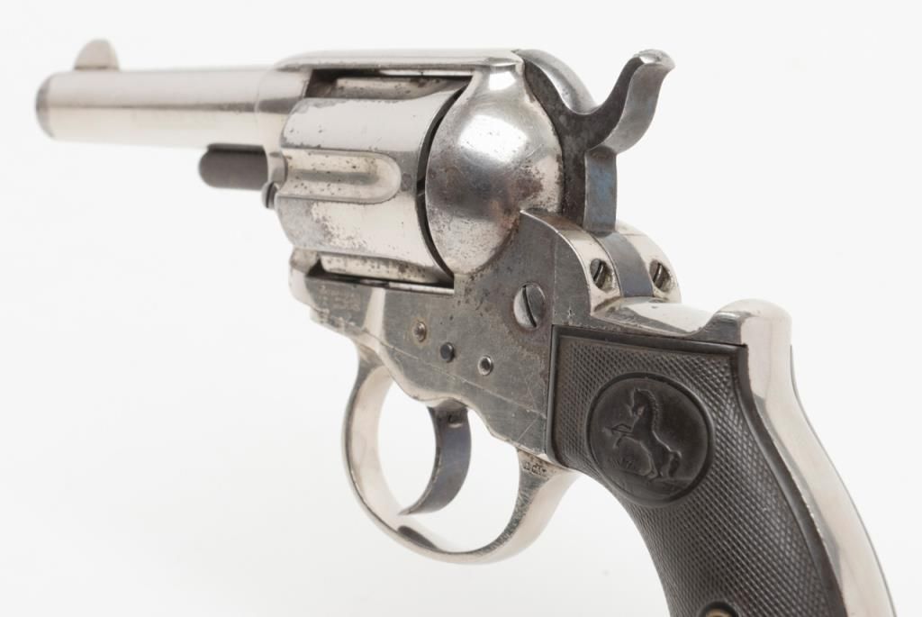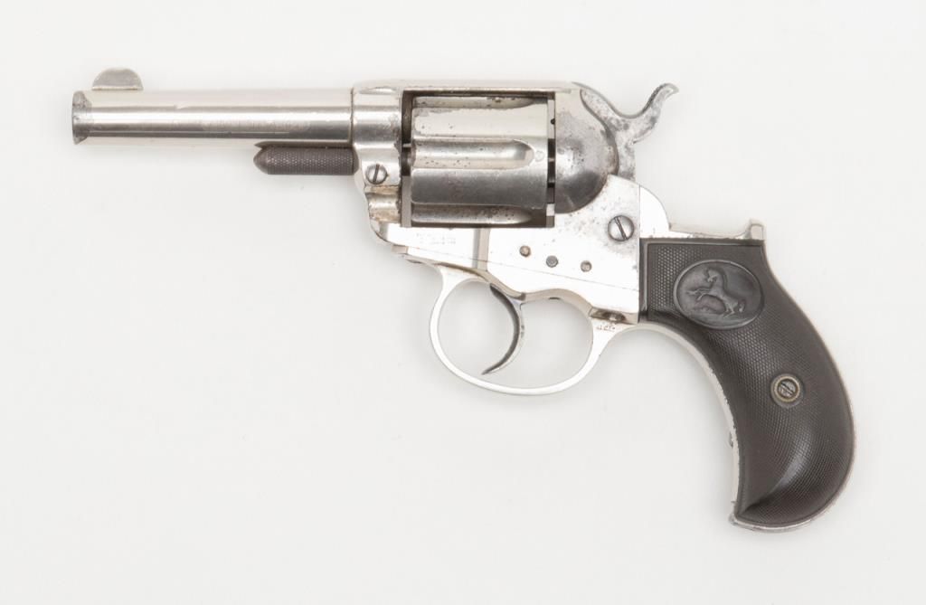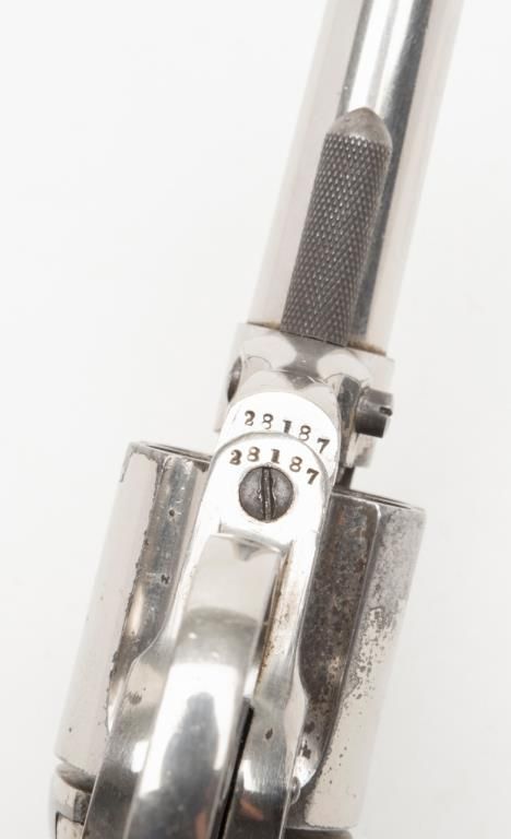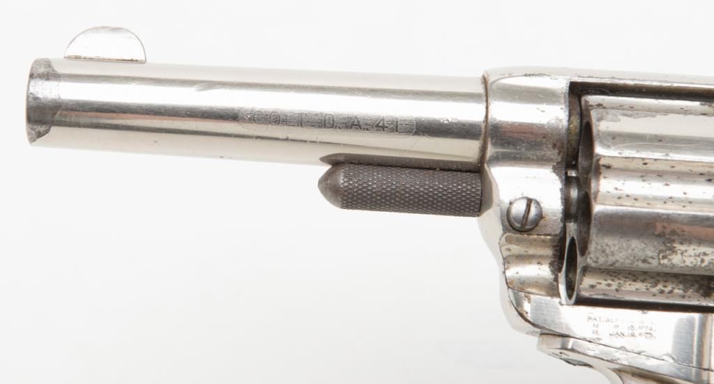 Colt Model 1877 DA ejectorless revolver, .41 cal., 3-1/2” barrel, nickel finish, checkered hard rubber grips, etched panel, #28187 in overall very good condition showing considerable original nickel finish, majority of etched panel remaining, good bore and markings, crisp action at time of description, very good grips with normal wear. (Antique). Est.: $700-$1,400.