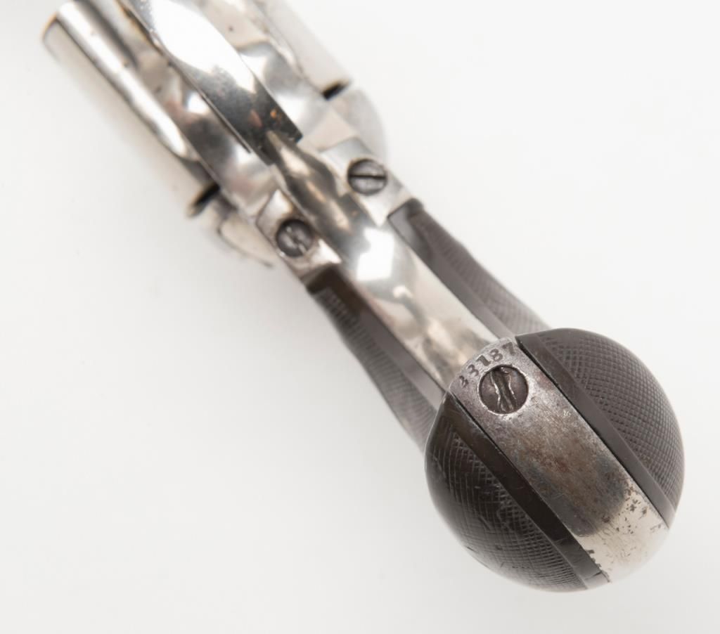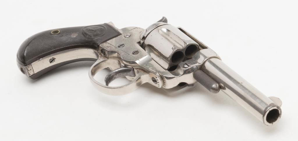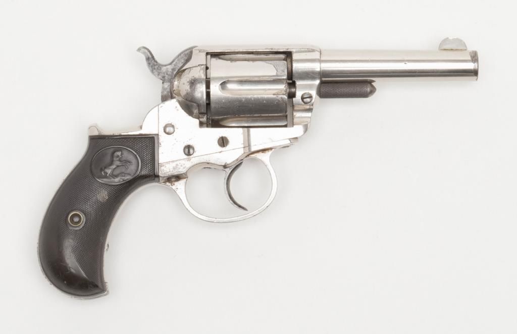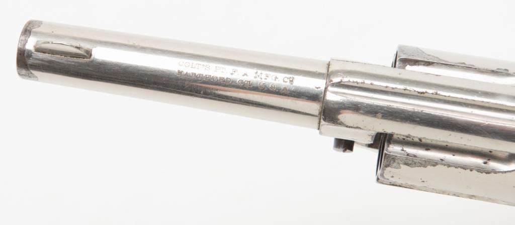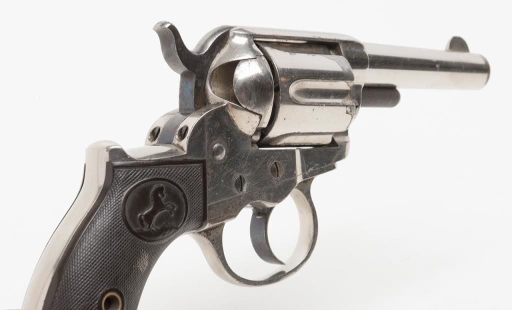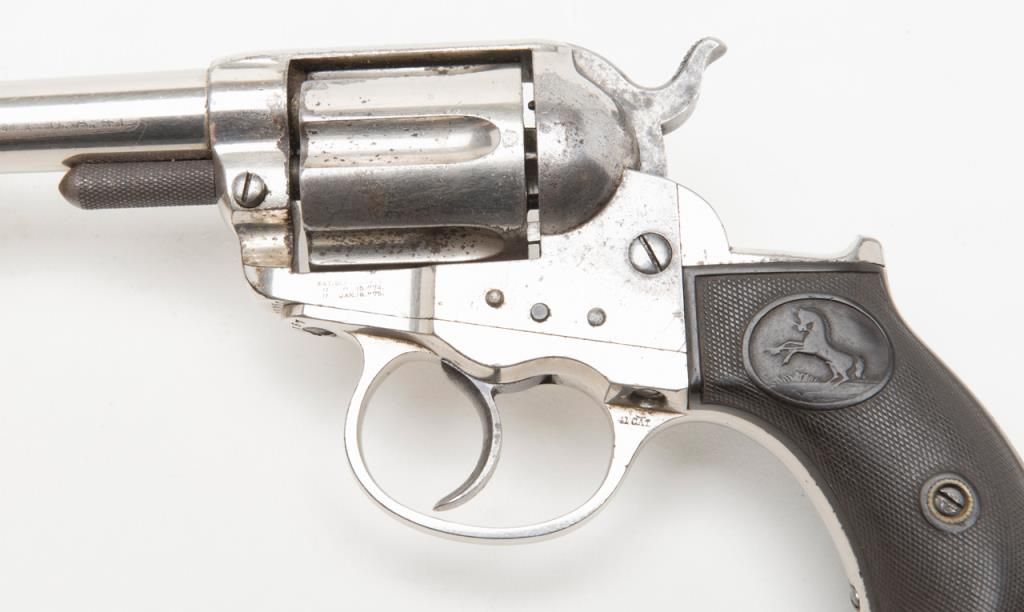 Colt Model 1877 DA ejectorless revolver, .41 cal., 3-1/2” barrel, nickel finish, checkered hard rubber grips, etched panel, #28187 in overall very good condition showing considerable original nickel finish, majority of etched panel remaining, good bore and markings, crisp action at time of description, very good grips with normal wear. (Antique). Est.: $700-$1,400.