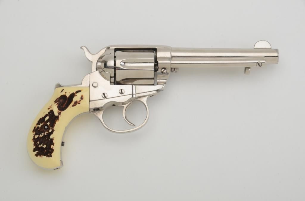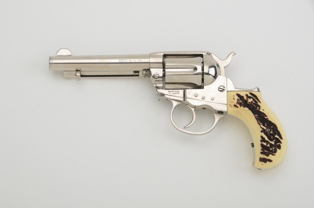 Colt Model 1877 DA revolver, .38 cal., 4-1/2” barrel, re-nickeled finish, faux stag grips, serial number re-stamped 1877. This gun is in overall good to very good condition as re-furbished showing the majority of itsnickel finish, good bore and markings, action is working at time of description, grips are very good. Est.: $350-$700.