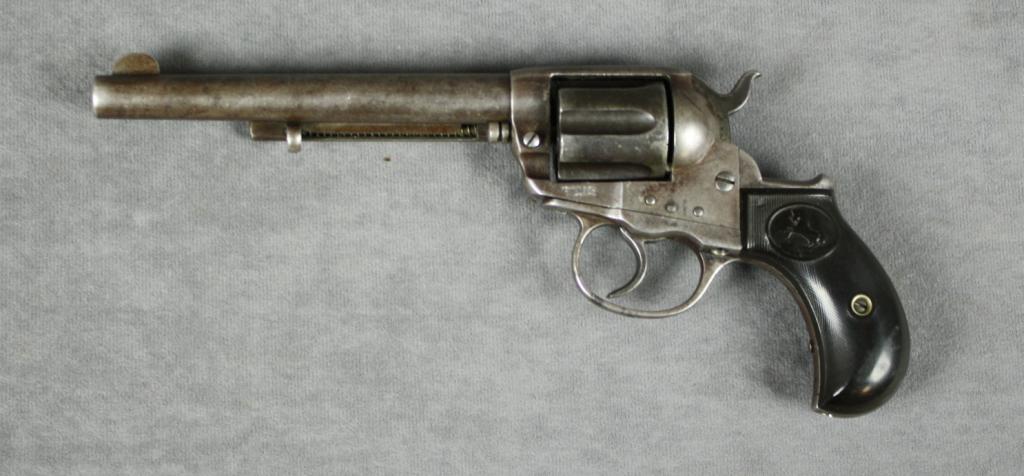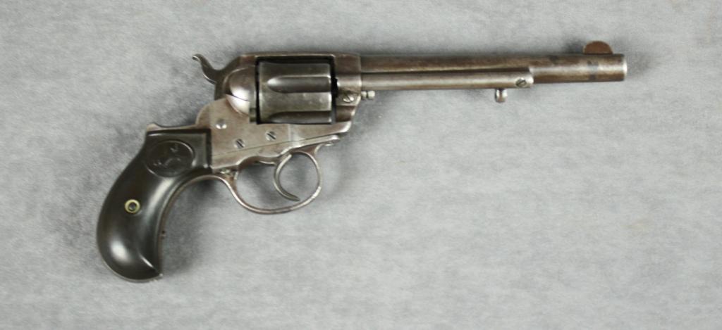 Colt Model 1877 DA revolver, .38 cal., 6” barrel, blue and case hardened finish, checkered hard rubber grips, #148706. This gun is in overall very good condition showing a grey patina on metal surfaces withscattered pin prick pitting and some spots of erosion, dark bore, action working at time of description, frame serial number has been freshened, good grips with years of classic wear; desirable with the 6” barrel. Est.:$500-$750.