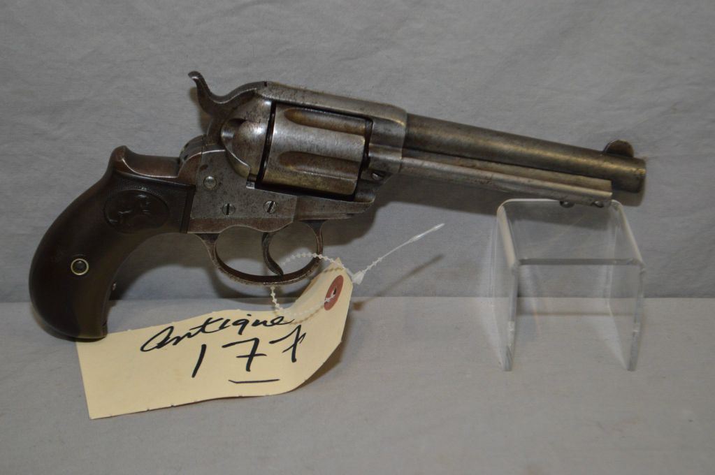 Colt Model 1877 Lightning DA ( The Thunderer ) .41 Colt Cal 6 Shot Revolver w/ 4 1/2" bbl [ non matching numbers, grip strap different number # 151293, traces of blued finish in protected areas, faded to grey with some light pitting turned brown in some areas, well worn checkered Colt insignia grips, Circa 1886 ] Ser # On Frame & Trigger Guard # 52726 ANTIQUE NO PAL REQ