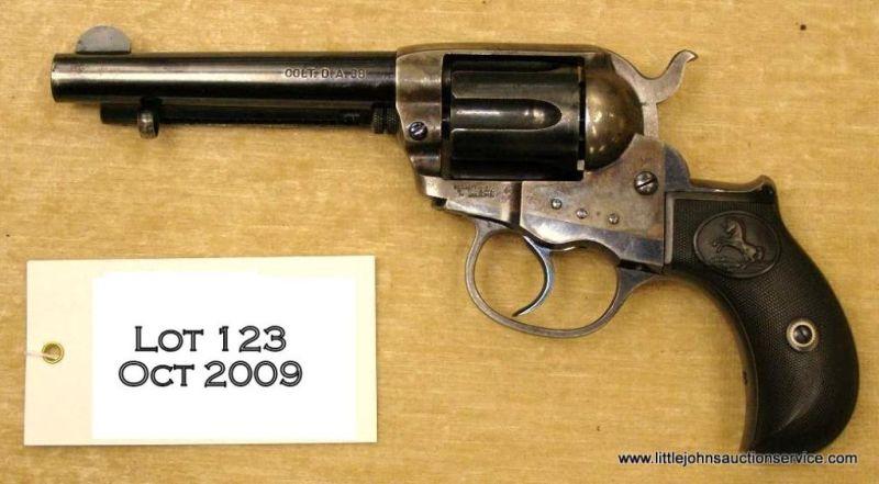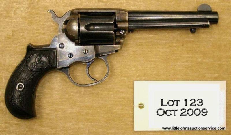 Colt Model 1877 Lightning DA revolver, .38 cal., 4-1/2” barrel, blue and case hardened finish, checkered hard rubber grips, #156560. This gun is in excellent overall condition showing approx. 85% original blue and 90% original case colors onframe, very good action at time of description, good bore, sharp markings; very good grips; all matching visible serial numbers. Est.: $1,400-$1,800.