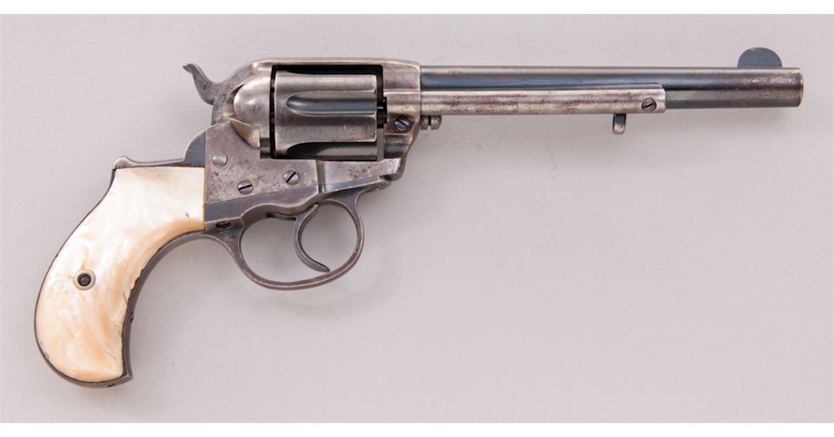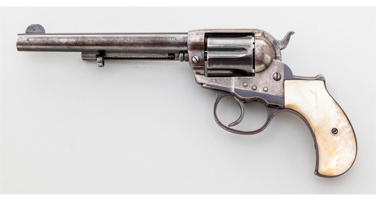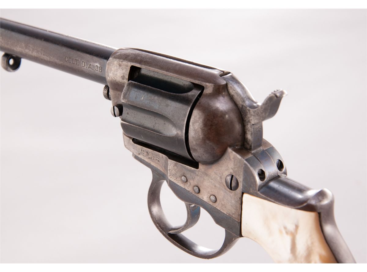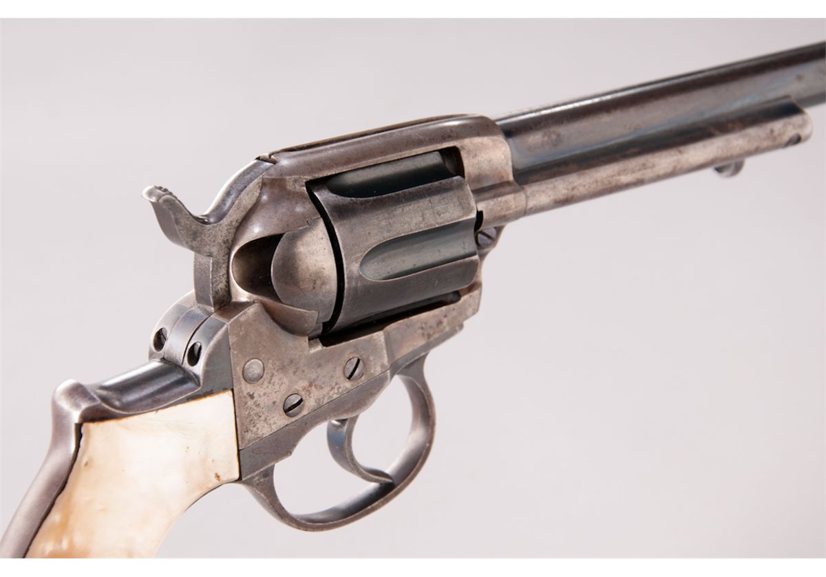 Colt Model 1877 Lightning Double Action Revolver, #150341, .38 cal., 6'' barrel, blue and case hardened finish, pearl grips. Mfg'd 1904. Condition is very good to fine retaining approx. 85% original blue and approx. 50% thinning and toning case colors, more vivid in protected areas. Hammer with carbon spotting to bright side. Iridescent grips show small losses and fractional shrinkage. Action is crisp, bore is excellent. Est.: $750-$1,000. (C&R)