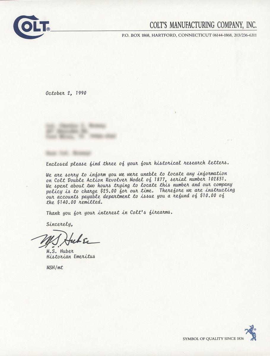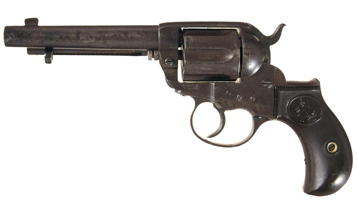 Manufactured in 1896, with standard markings and features. The front sight has been heavily modified during period of usage. Complete with Colt letter explaining that factory records for this specific revolver were not able to be located.