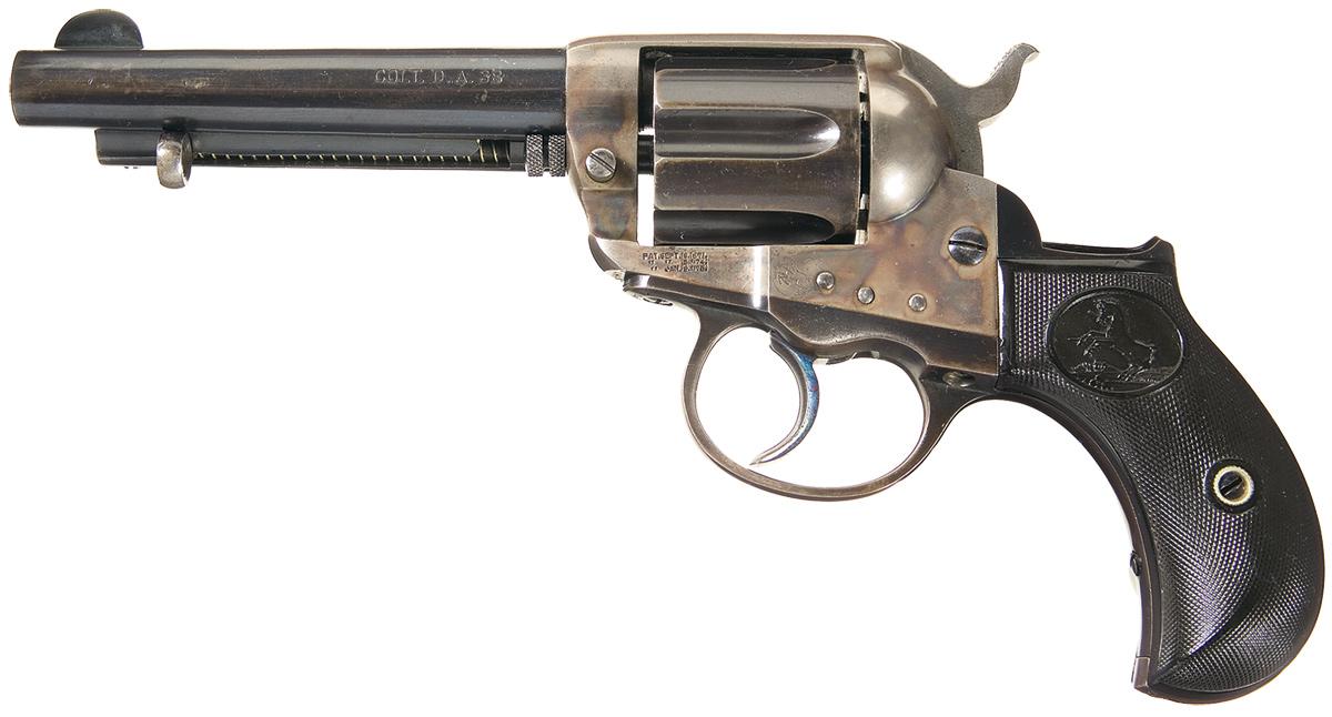Manufactured in 1897, this revolver was produced with a 4 1/2 inch barrel and ejector rod with round bull's-eye or donut shaped rod head. The top of the barrel is marked with the two-line Colt Hartford address, "COLT D.A. 38" on the left side, the three line, three patent date marking appears on the left side of the frame followed by the circled Rampant Colt. Matching serial number on frame, trigger guard and backstrap. Equipped with a blade front and frame notch rear sights and fitted with checkered hard rubber grips with the Rampant Colt in an oval at the tops.