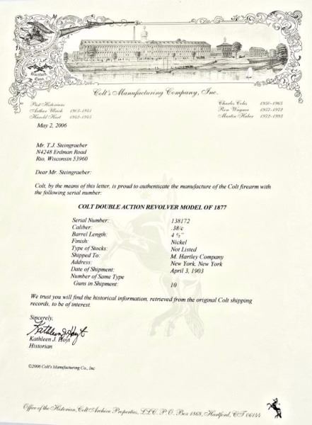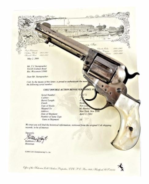 4 1/2" Barrel Nickel, With Colt Factory letter. Shipped to M. Hartley Company New York,New York