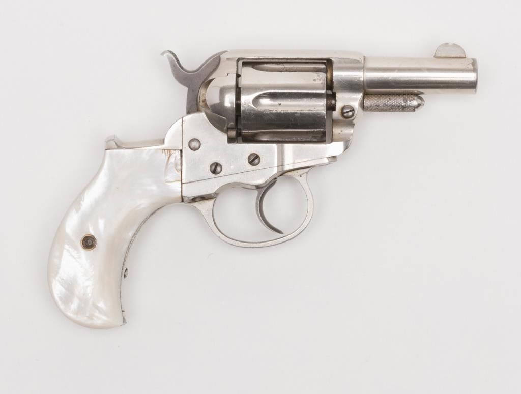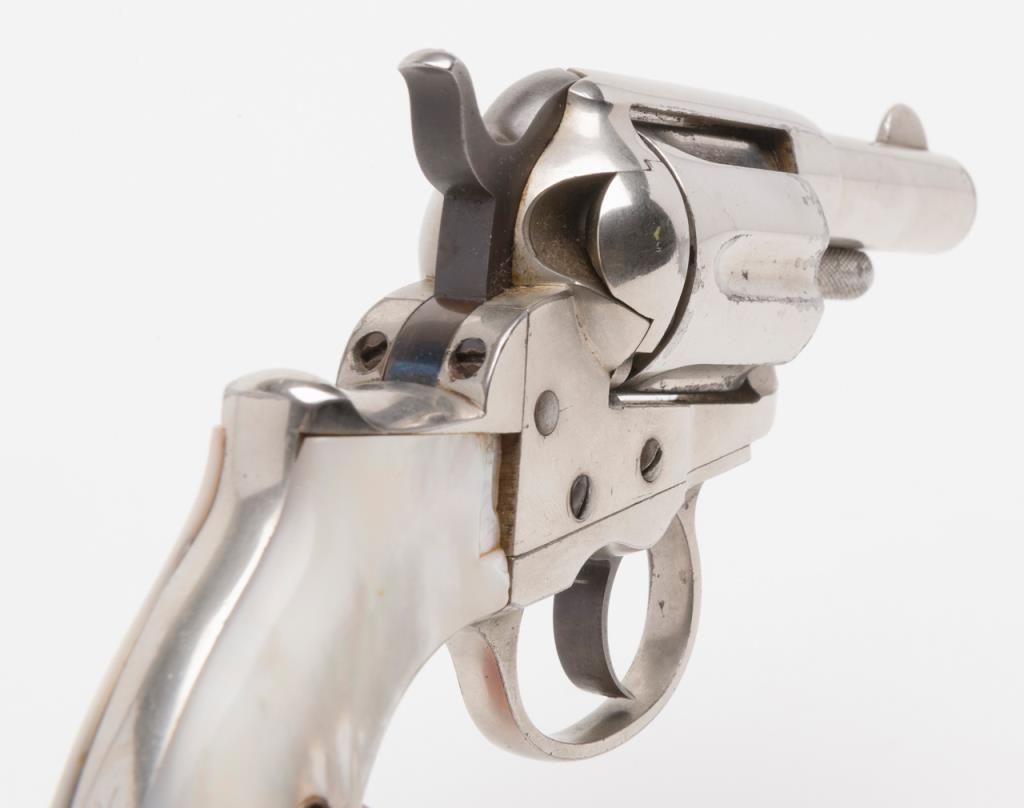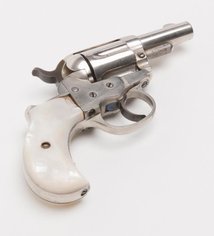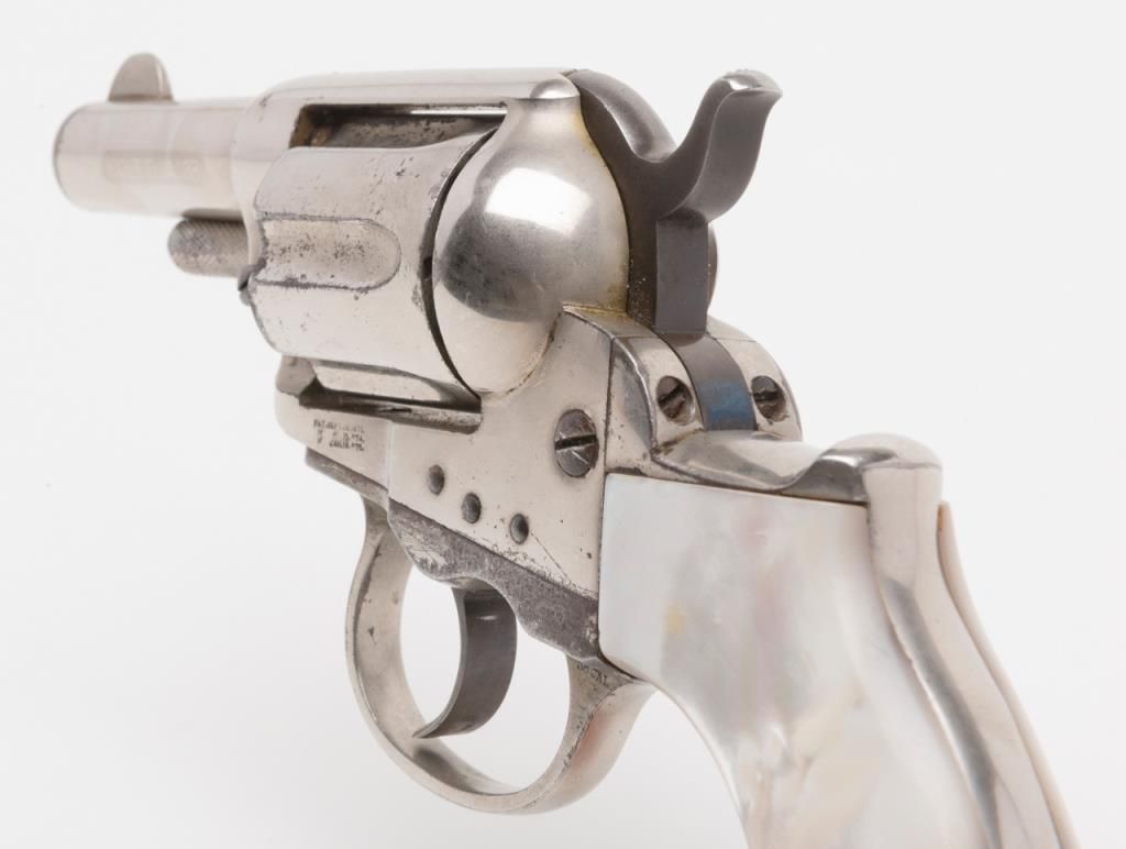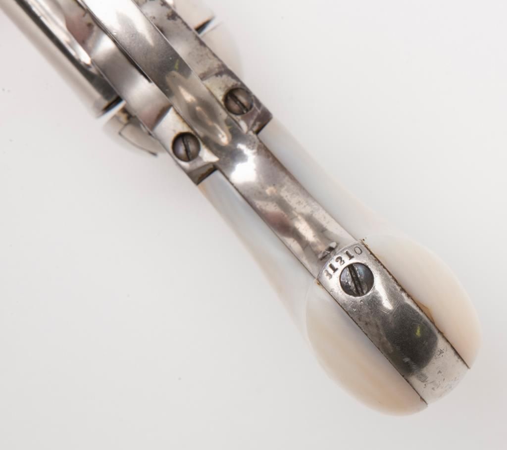 Colt Model 1877 Lightning ejectorless DA revolver, .38 cal., 2-1/2” barrel, etched panel, nickel finish, pearl grips, #31210 in overall very good to near fine condition showing the majority of its original frosted nickel finish, fully visibleetched panel on left side of barrel, crisp action at time of description, very good bore, sharp markings, beautiful iridescent pearl grips with old chip loss at the top front corner of the right grip. From the estate of Joe Kiser. (Antique). Est.: $1,200-$2,400.