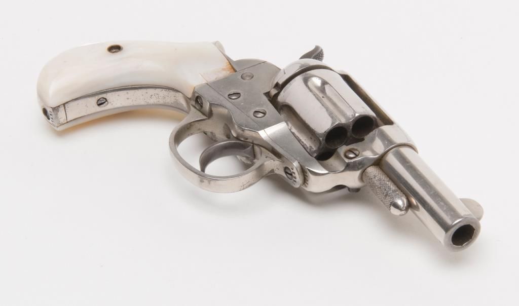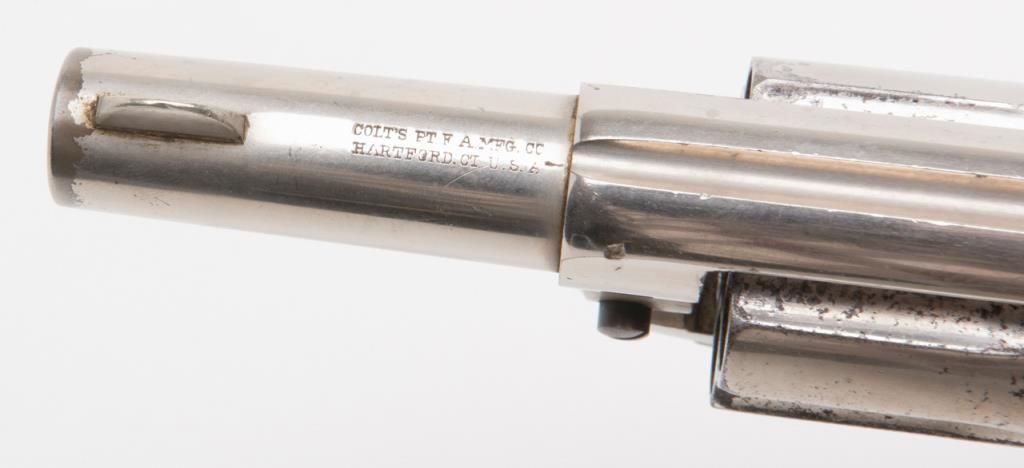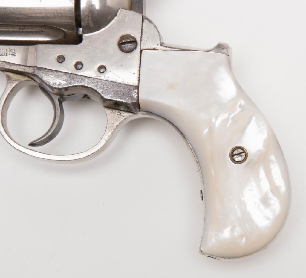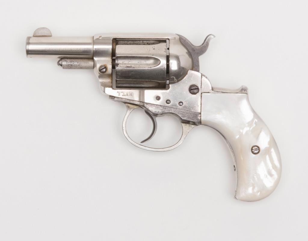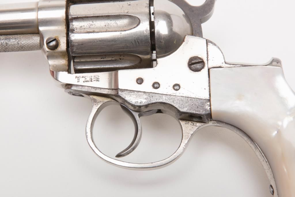 Colt Model 1877 Lightning ejectorless DA revolver, .38 cal., 2-1/2” barrel, etched panel, nickel finish, pearl grips, #31210 in overall very good to near fine condition showing the majority of its original frosted nickel finish, fully visibleetched panel on left side of barrel, crisp action at time of description, very good bore, sharp markings, beautiful iridescent pearl grips with old chip loss at the top front corner of the right grip. From the estate of Joe Kiser. (Antique). Est.: $1,200-$2,400.