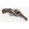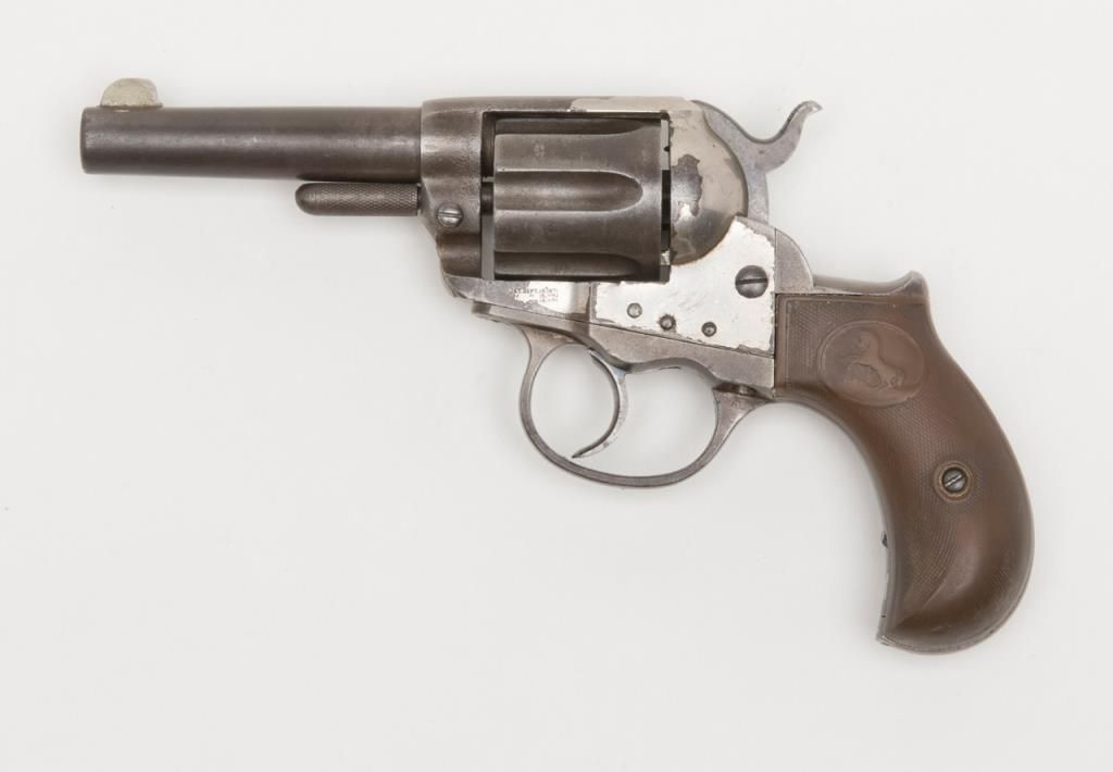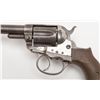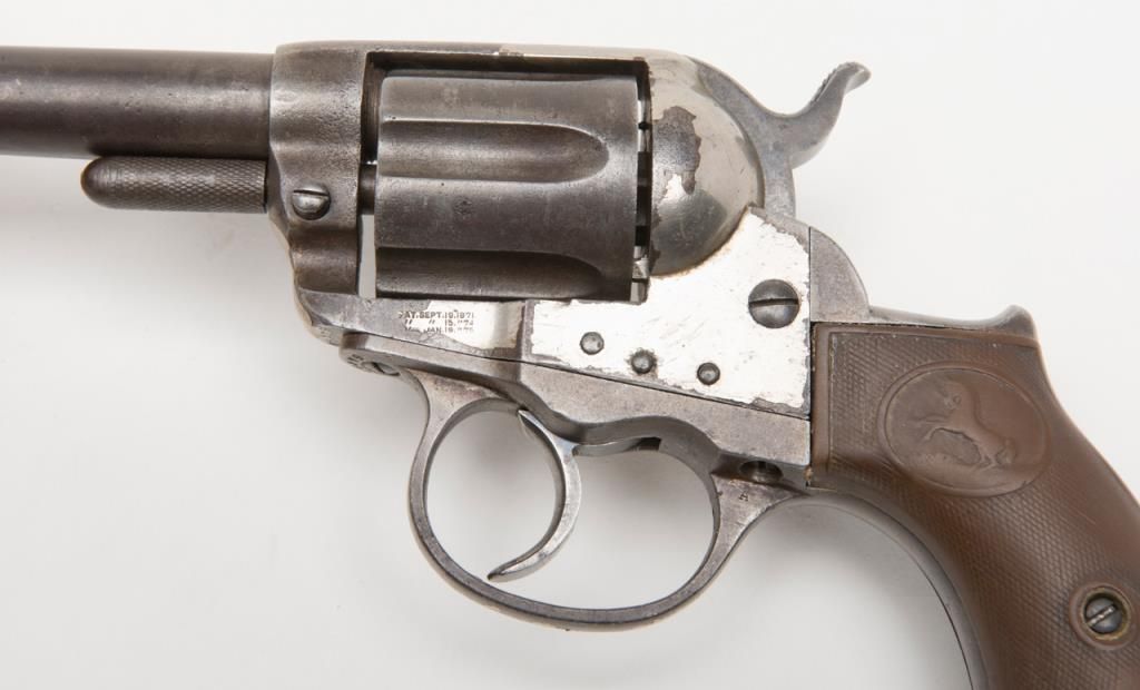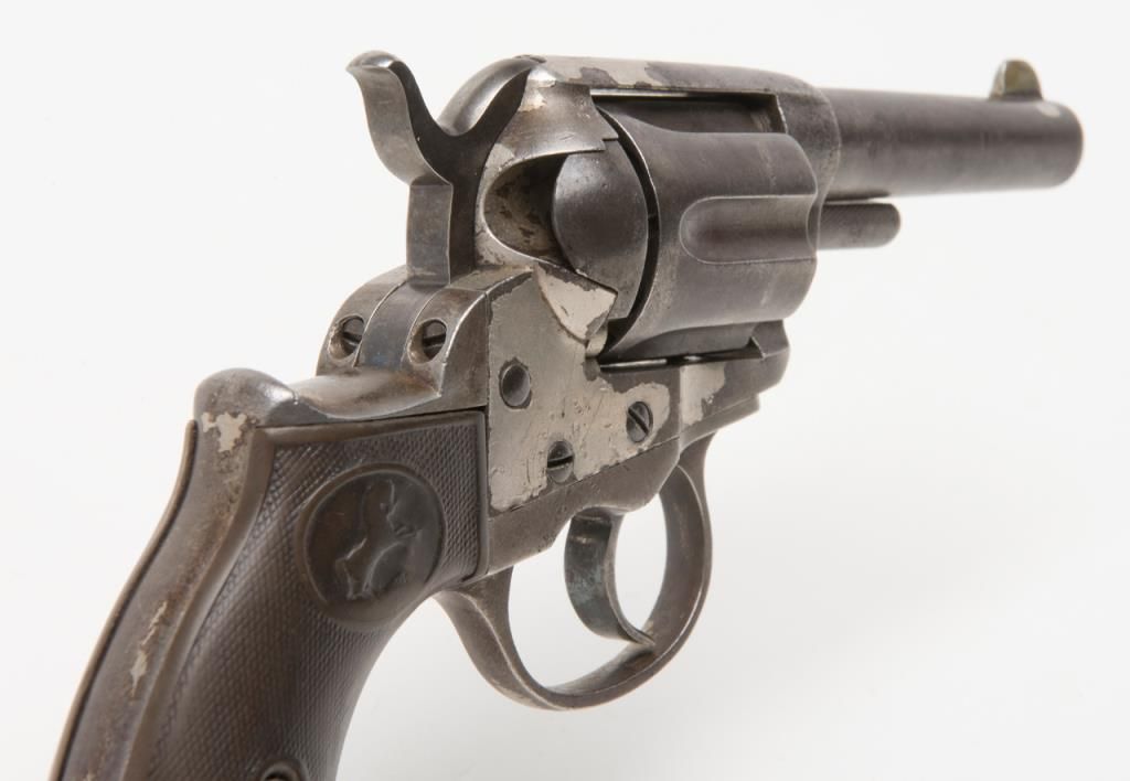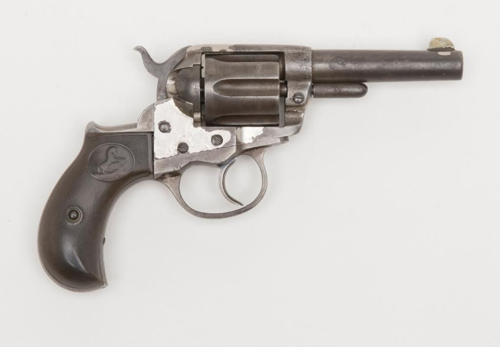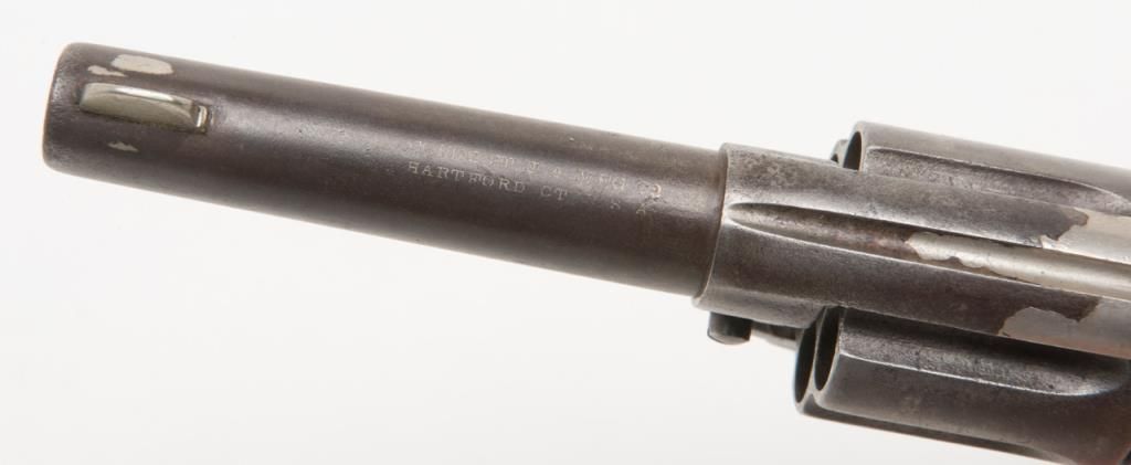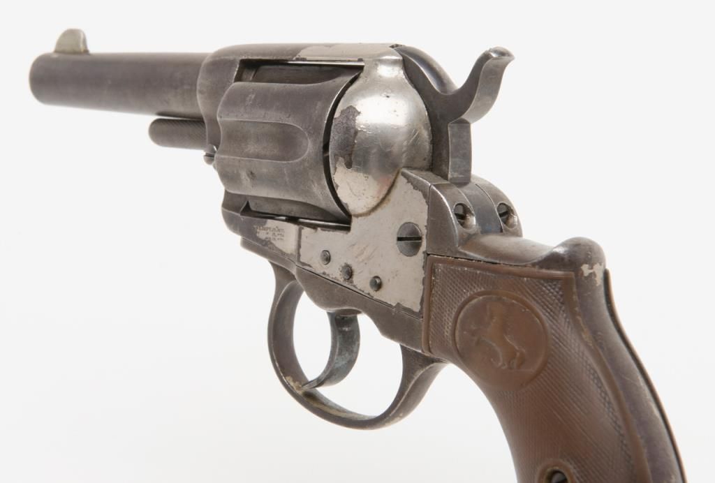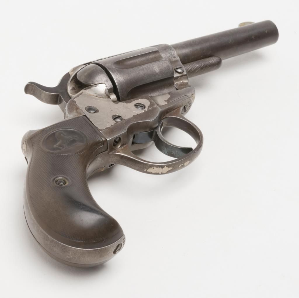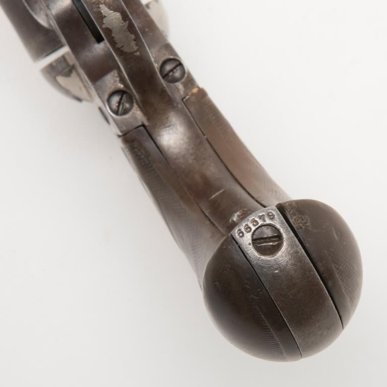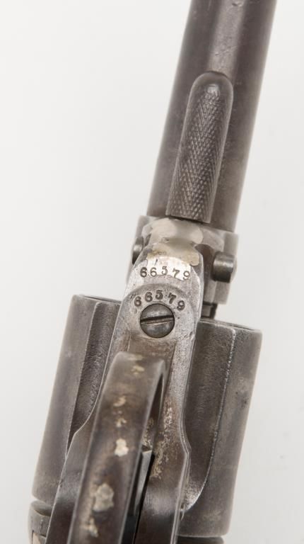 Colt Model 1877 Lightning revolver, .38 caliber, Serial #66579. The Storekeeper model, made without an ejector is in overall good condition with a 3 ½” barrel. The period nickel finish is confined primarily to the pistols frame with onlyapproximately 20% still showing. The rest has drifted to a gray patina, with some case color visible on the trigger in protected areas. Although faint, the barrel address is still visible along with the patent dates below thecylinder, the front sight is a well done replacement. The hard rubber grips show wear but appear intact without chips. The bore is good, while the action works in double action, but the hammer will not remain cocked. The pistol wasmanufactured in 1888. (Antique). Est.: $300-$600.