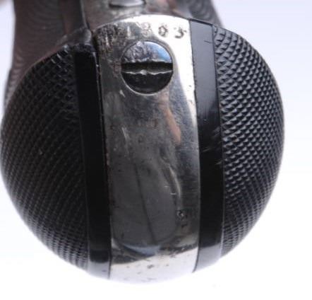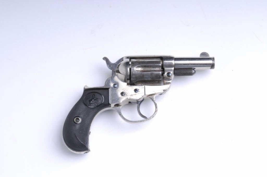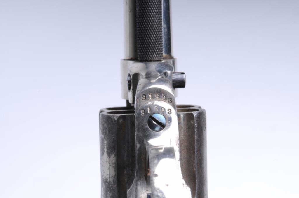 Colt Model 1877 ejectorless DA Lightning revolver, .38 caliber, scarce 2.5” barrel, nickel finish, checkered hard rubber grips, S/N 91803 (all matching visible numbers), in overall very good+ condition showing approximately 65% originalfinish with scattered erosion confined primarily to the cylinder, original niter blue on the hammer, trigger and screw heads; crisp action at time of description, near fine grips, sharp markings and very good bore. (Antique).Est.: $1,200-$2,400.