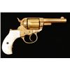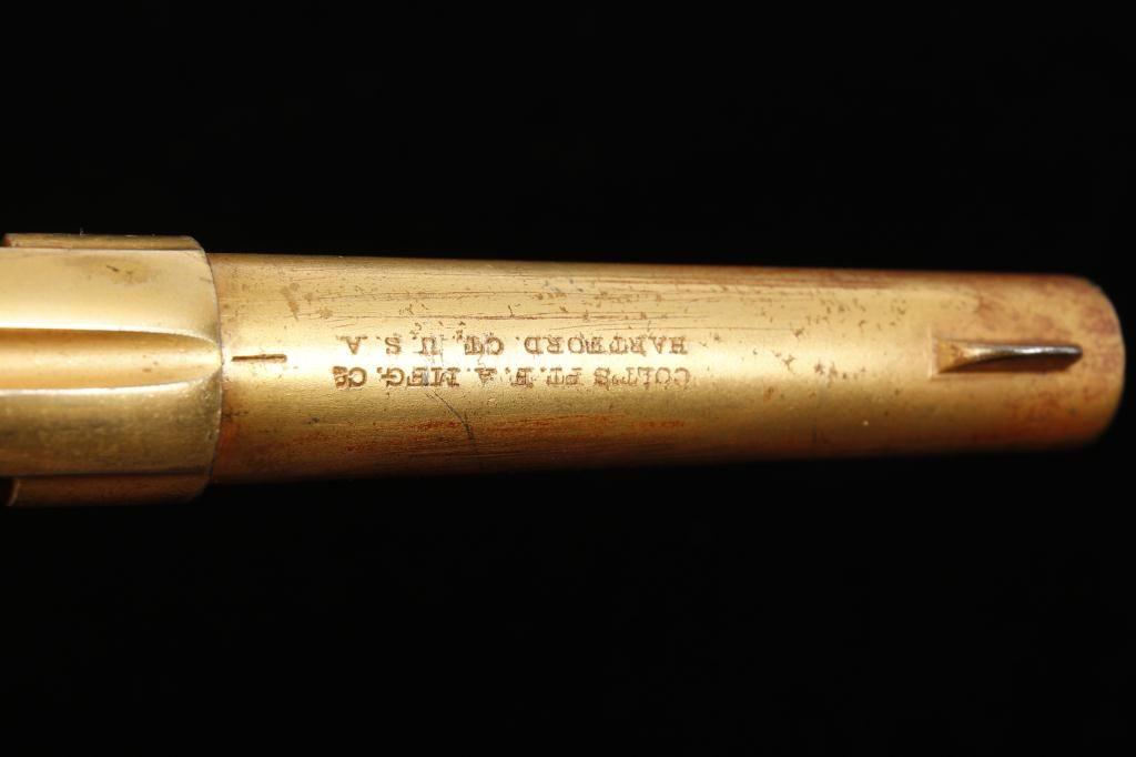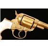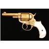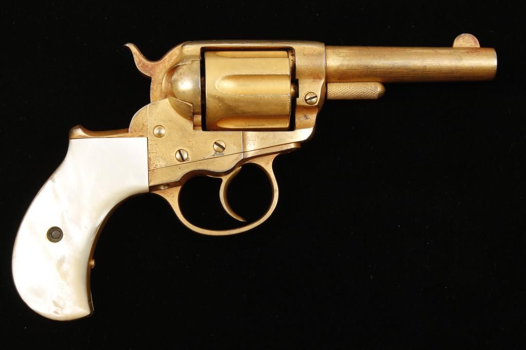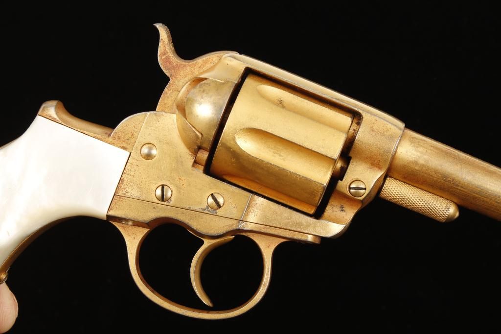 Colt Model 1877 ejectorless DA revolver, .38 cal., 3-1/2” barrel, etched panel, gold finish, pearl grips, #57514. This gun is in overall very good condition showing the majority of an old gold wash finish withfaint but near completely visible etched panel on left side of barrel, very good bore and markings, action is in need of repair, grips are beautifully iridescent and overall very good +; all matching visible numbers.Est.: $1,500-$3,000.