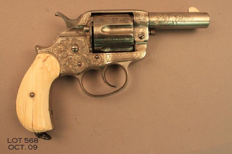 Colt Model 1878 DA Sheriff’s model revolver, 44-40  cal., 3-1/2” barrel, engraved, nickel finish,  ivory grips, #21703. This gun is in overall very  good condition showing approx. 60% original finish  with the balance of metal surfaces showing aneven nickel tone, good bore, action, markings and  period engraving. The grips are ivory and fit  nicely but do not appear to be original to this  gun with and old repaired crack in the right grip.   Est.:  $1,500-$3,000.