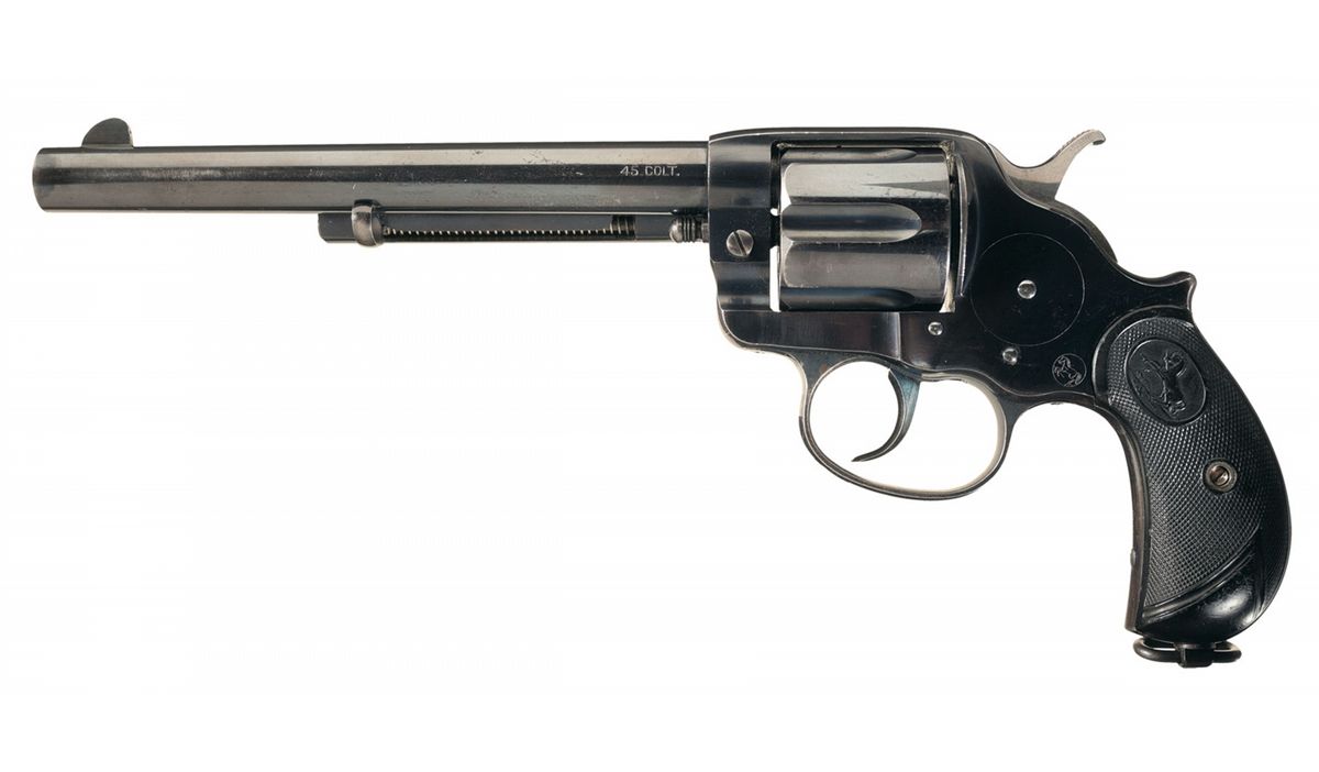 Manufactured in 1898. The barrel has the one line Hartford address on top and "45 COLT" on the left side. The left side of the frame has a circled Rampant Colt. The partial serial number "333" is located on the back of the cylinder and the assembly number "50" is on the left side of the frame under the grip and loading gate. Blue finish with niter blue trigger and hammer. Fitted with checkered Rampant Colt grips.
