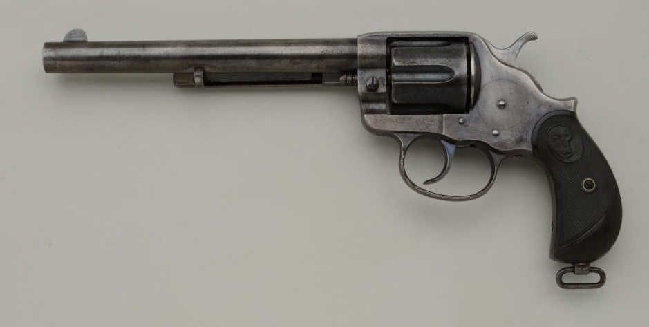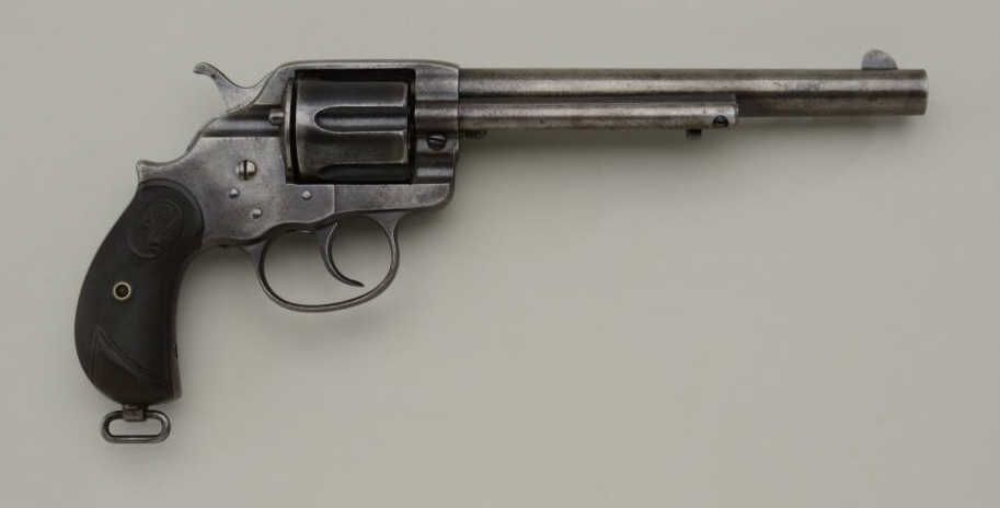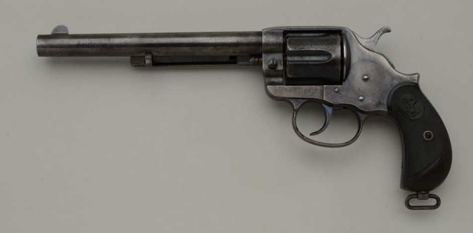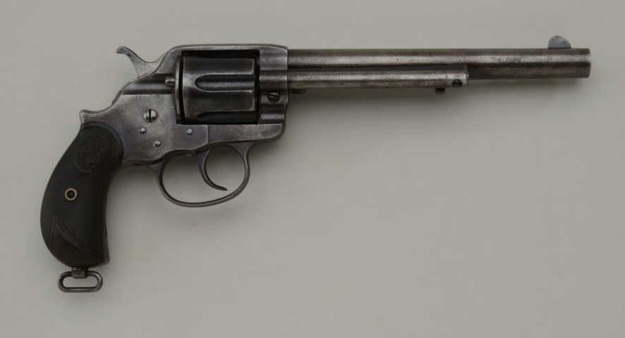 Colt Model 1878 Double Action Frontier revolver in .45 long colt caliber with 7 ½” barrel, blue finish, hard rubber grips, serial number 49850. This revolver shows 50% to 70% thinning original blue finish that isdrifting and aging nicely. The front sight is its full original height and markings and barrel address are sharp. The action works well on double action but is not staying cocked on single action. The grips fitimpeccably and are in very good condition with just slight edge wear. The bore is good to very good and still bright. Est.: $1,000-$2,000