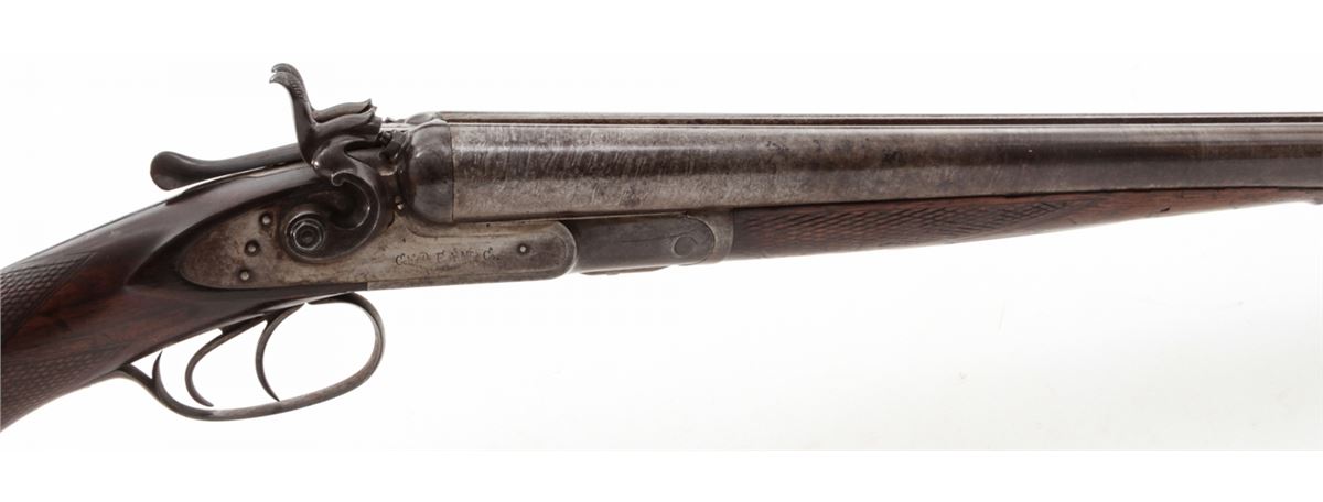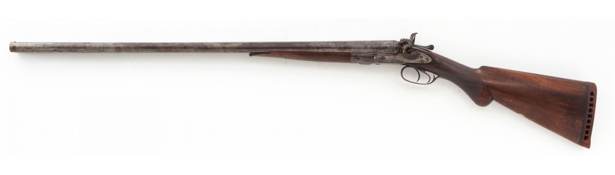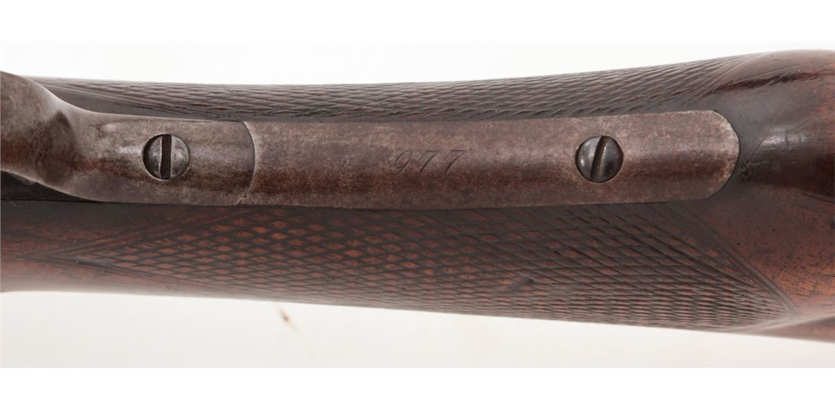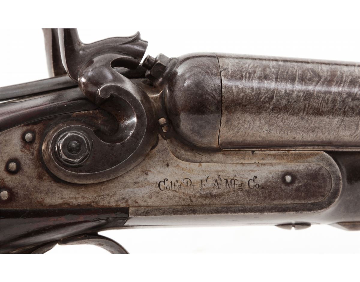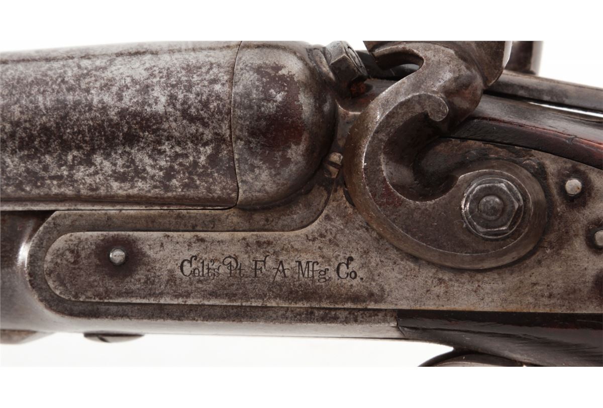 Colt Model 1878 Double Barrel Shotgun, #977, 12 ga., 30'' damascus barrels, exposed hammers, case hardened frame, walnut stock and forend, with 1920s era Redhead rubber butt pad. Condition is about very good. Barrel with toning, some splotching and patination. Frame has thinned and toned as well. Stock with impressions, scratches, and flattening to checks. Good action and bores. Est.: $500-$750. (Antique)