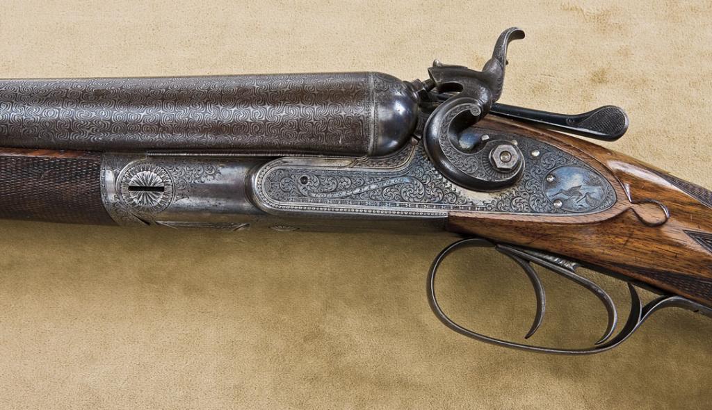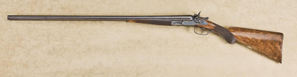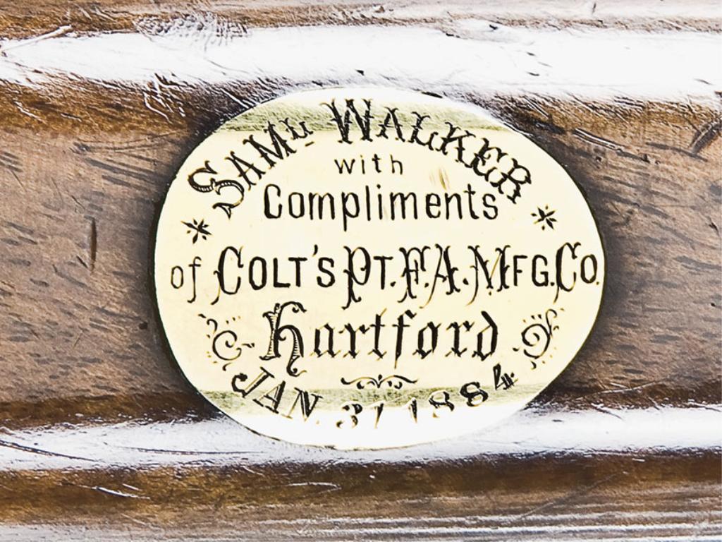 Colt Model 1878 SxS exposed hammer shotgun, 12 gauge, 32” Damascus pattern barrels, brown and case hardened finish, deluxe checkered wood stocks, fancy engraving, factory inscribed gold inset under butt stock “Sam’l Walker with compliments of Colt’s PTFA Mfg. Co. Hartford, Jan. 31, 1884”. This important factory presentation gun is in overall fine condition showing 98% original Damascus finish on the barrels, exceedingly fine engraving and three game panel scenes on the receiver; approx. 50% case colors on the receiver, fine bores, crisp action, finely grained deluxe wood stocks with delicately checkered fore stock and pistol grip; wood is fine overall with just scattered small scratches, nicks and impressions; steel butt plate. Accompanied by documentation including a factory letter that confirms all features as factory and that the gun was presented to Samuel Walker, one gun, date of presentation is January 31, 1884. Also included is an R.L. Wilson letter stating that he is confident the inscription and the engraving on the gun was accomplished by master Cuno A. Helfricht. He also summarized additional documentation accompanying this gun that indicates Samuel Walker immigrated from Scotland to America in 1852 and began employment at the Colt factory in 1861 and remained there until January, 1884 during which time he was the factory’s paymaster and supervisor of the Store Room where the factory Museum collection of firearms were kept. Wilson also notes there were only four such Model 1878 shotguns presented by the factory during the period of their production 1878-1889 (total of only 22,690 produced). An important Colt presentation in superb condition. From the Richard Wolfe Collection. Est.: $5,000-$10,000.