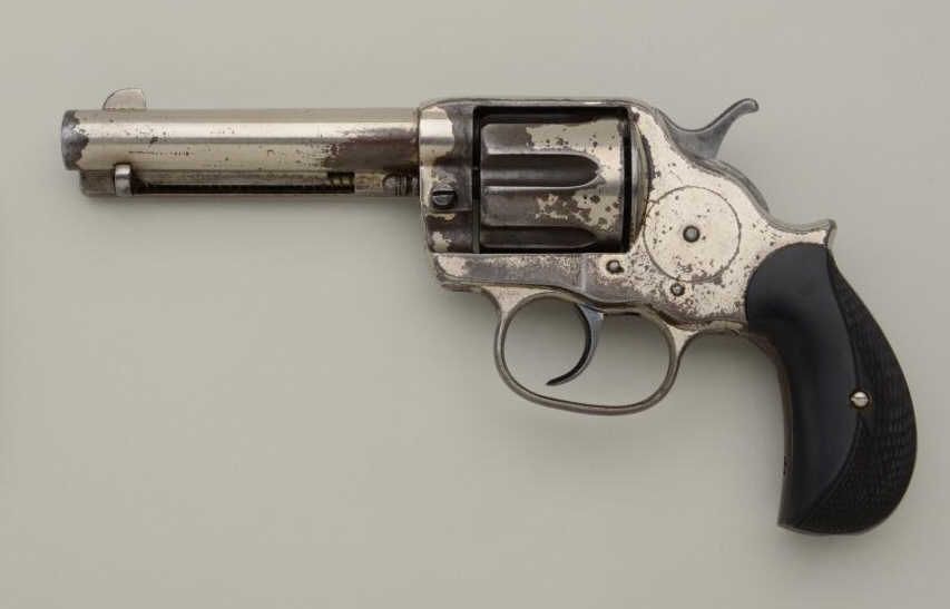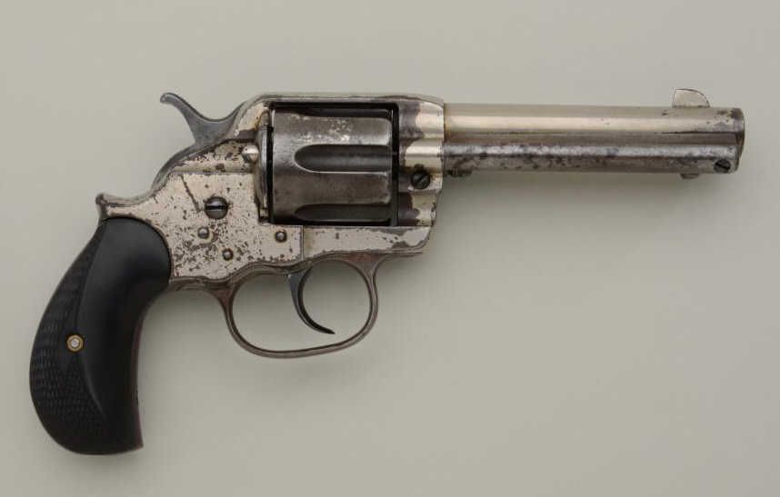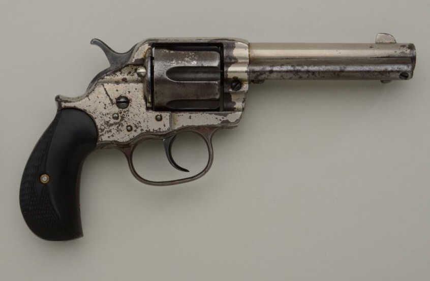 Colt Model 1878 double action frontier revolver in .45 long colt caliber with 4 ¾” barrel, nickel finish, checkered ebony grips, serial number 7652 with wide or large grip profile. Approximately 30% to 50% originalnickel remains that is peeling, scaling, and flaking and the areas where the nickel has lifted is gone to a dark brown patina with some minor pitting and erosion. The 2 line barrel address is crisp and marking ontrigger guard visible. There has been a lanyard removed from the butt. The grips though very well-made and attractive are more modern. The metal and nickel are completely uncleaned with no polishing. Action isworking and the bore is fair but timing and lock not quite right. Est.: $400-$800.