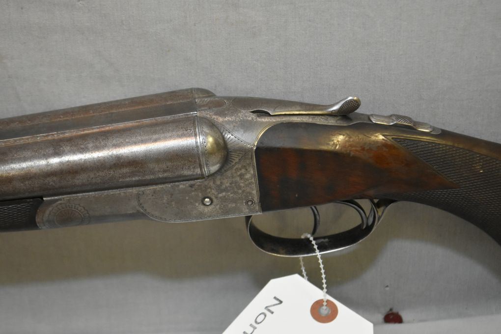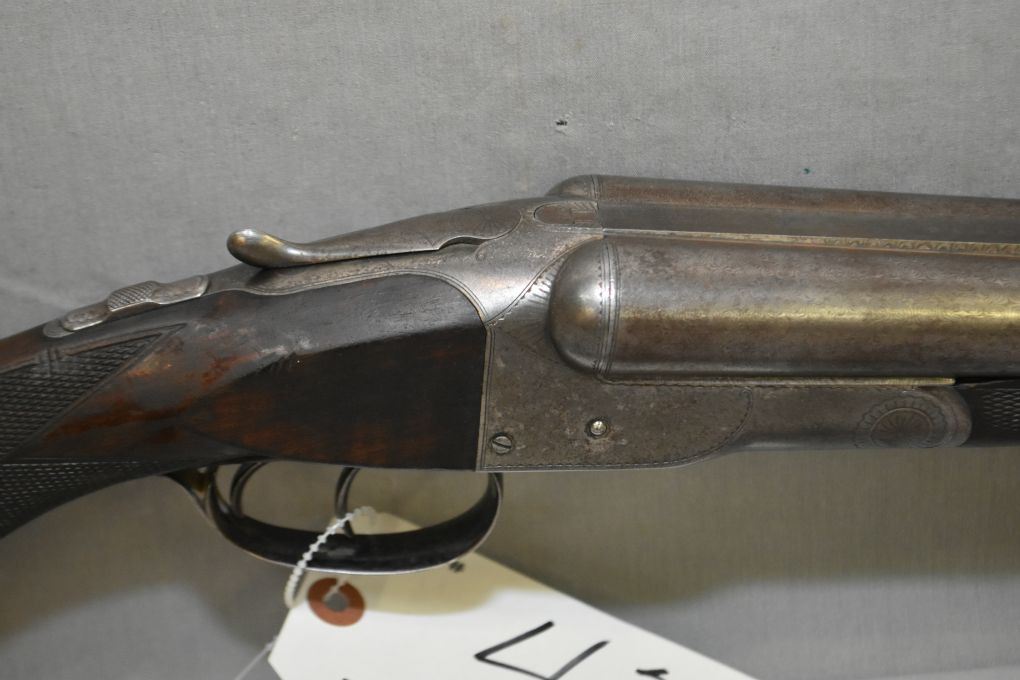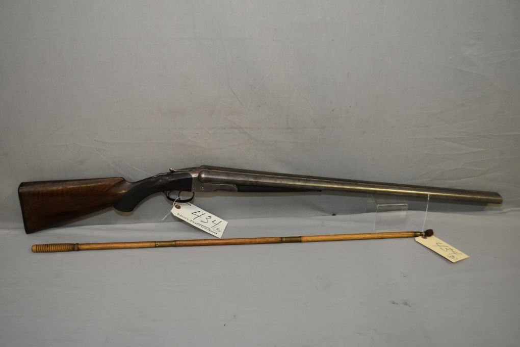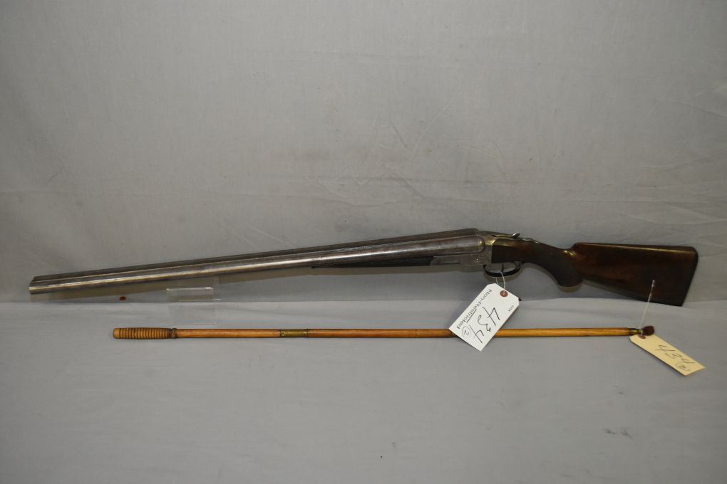 Colt Model 1883 .12 Ga Side By Side Hammerless Shotgun w/ 30" bbls [ fading Damascus pattern barrels turning brown, marked COLT'S PT.F.A.MFG.CO.HARTFORD, CT. USA, Standard Model with light engraving, case colored receiver, turned silver & flaking, Marked PATENTED AUG.22 SEP.19.1882 , wood with some flaking varnish & few marks, checkered forend has ebony forend tip with two sliver missing out of both sides, Colt butt plate with small chip at toe, c/w three piece wooden cleaning rod ( possibly not original to gun ) Manufactured from 1883 to 1895, Total Quantity Approx. 7,366 ] Ser # 6665