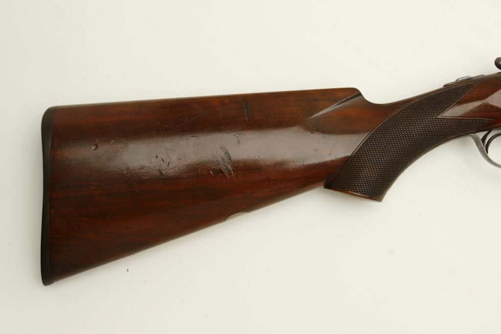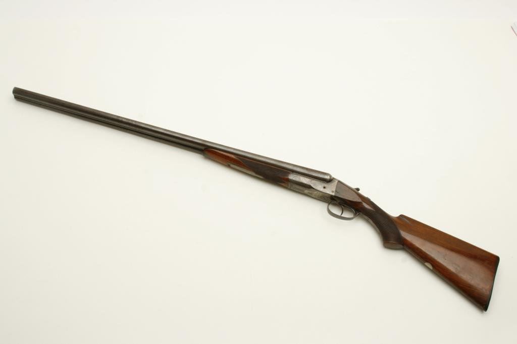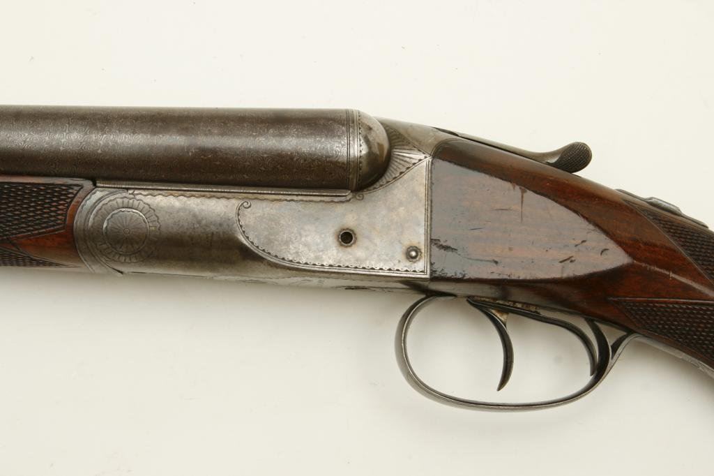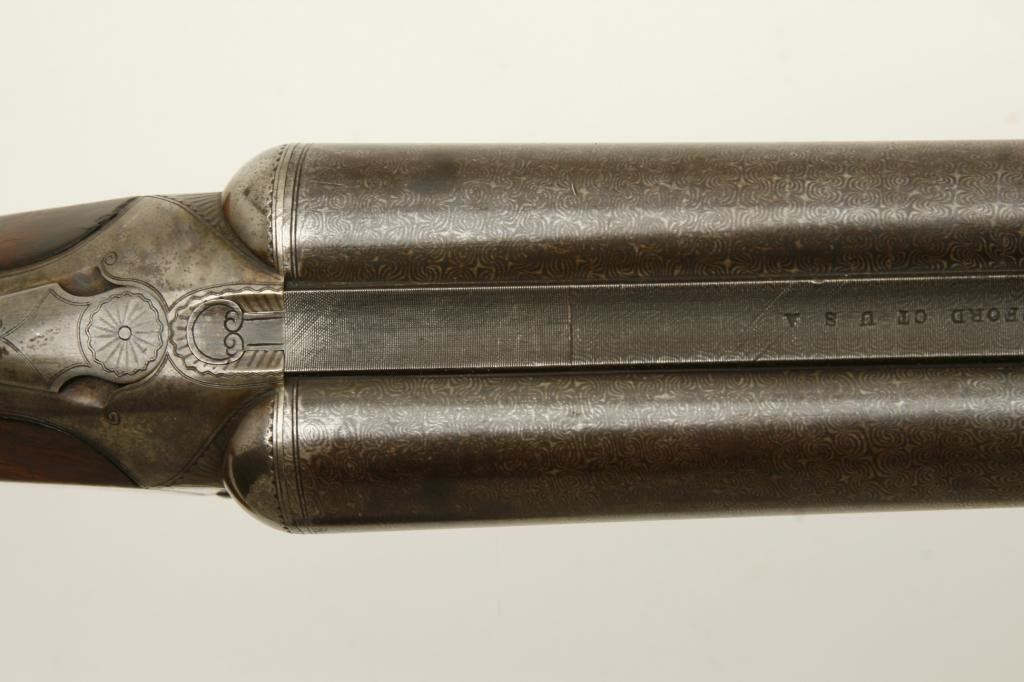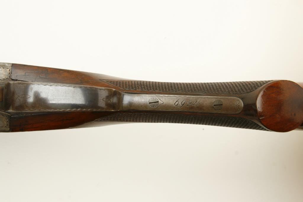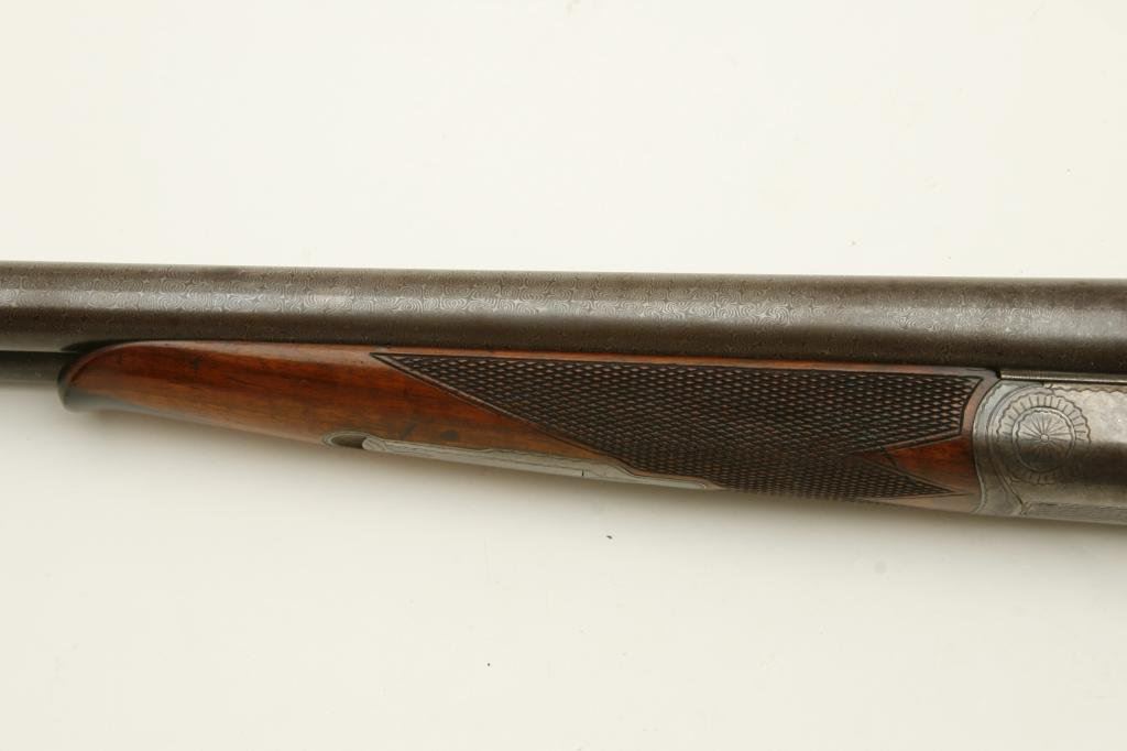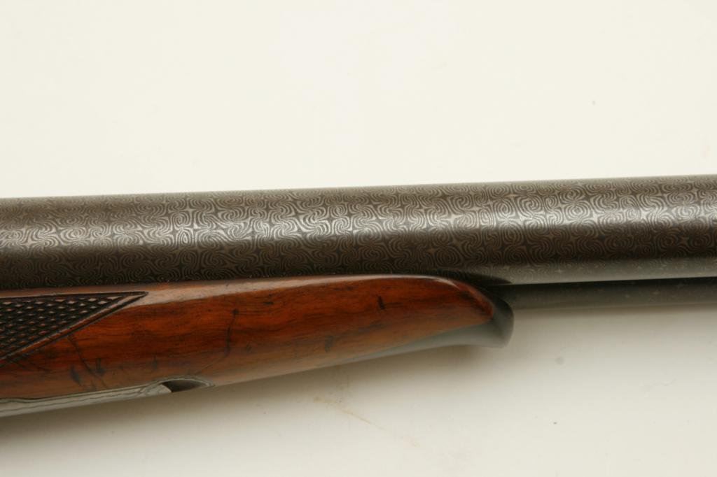 12GA in near fine original condition, S/N 6924 with 30” Damascus barrels showing well defined pattern and normal aging. 50%-60% original case hardening with some light rainbow hues still showing. 50% blue on the trigger guard. Very good plus wood with crisp checkering and minor imperfection. Original hard rubber butt plate. Locks tight with very good bores. An exceptional specimen of which only about 7000 were made. (Antique) Est.: $3000-$6000