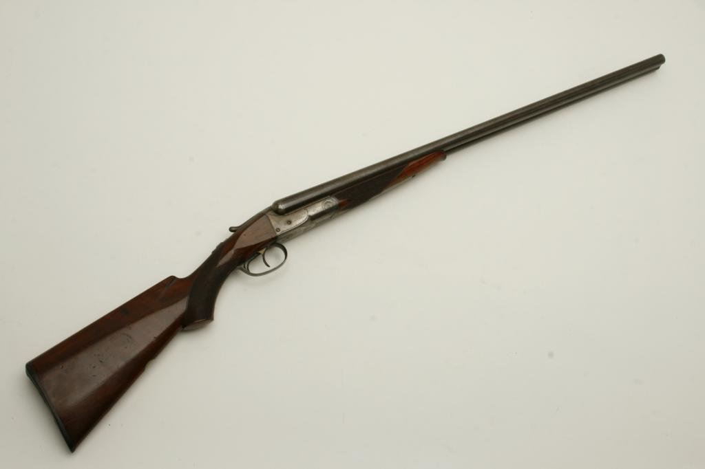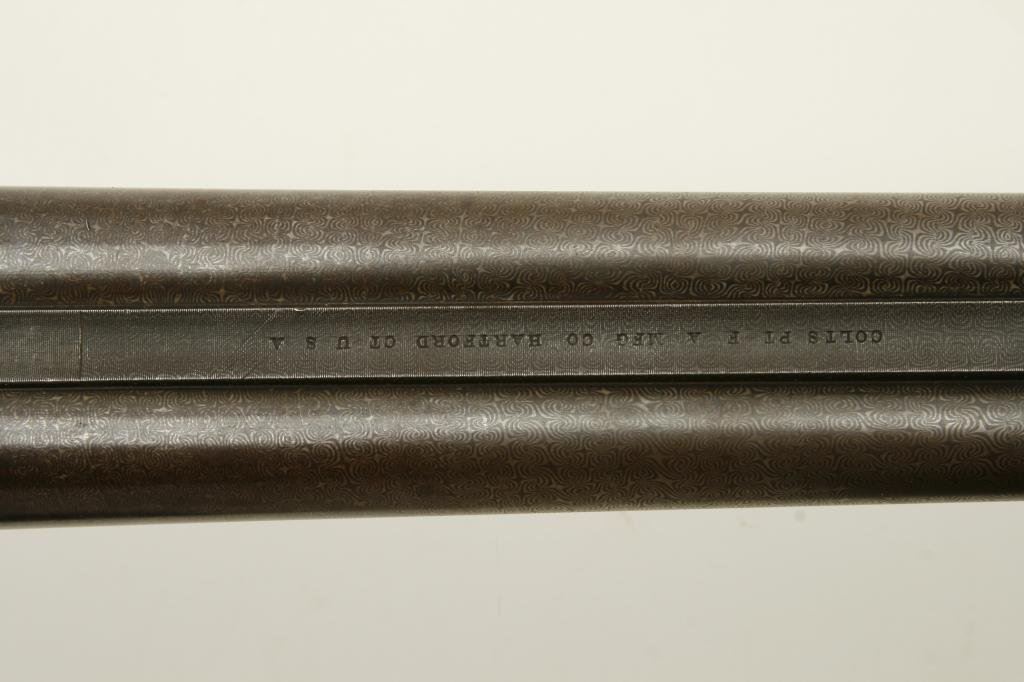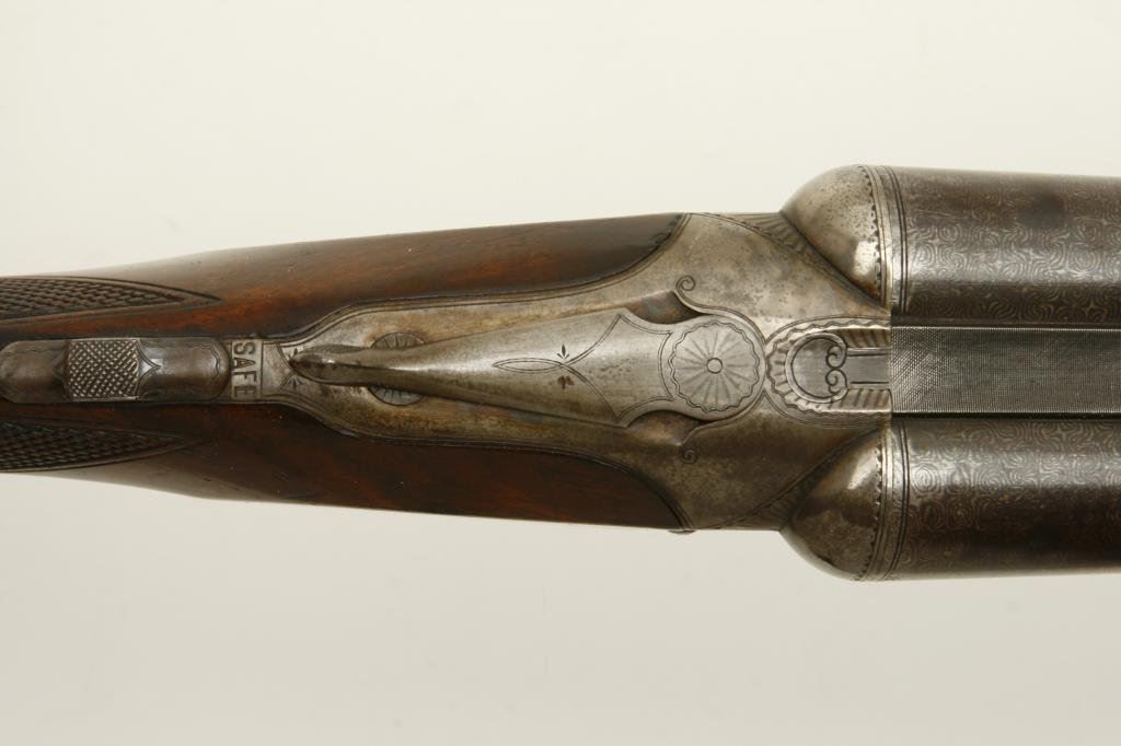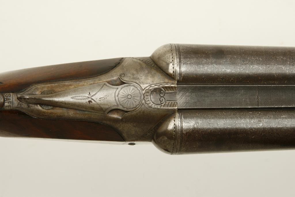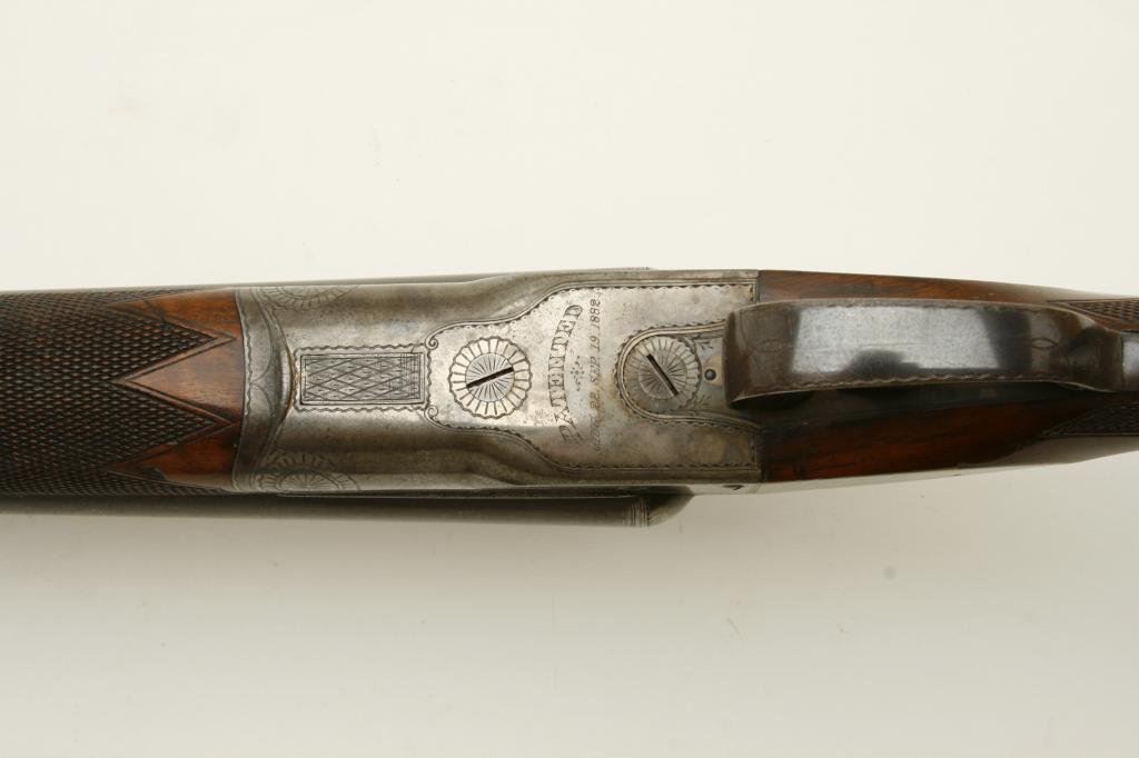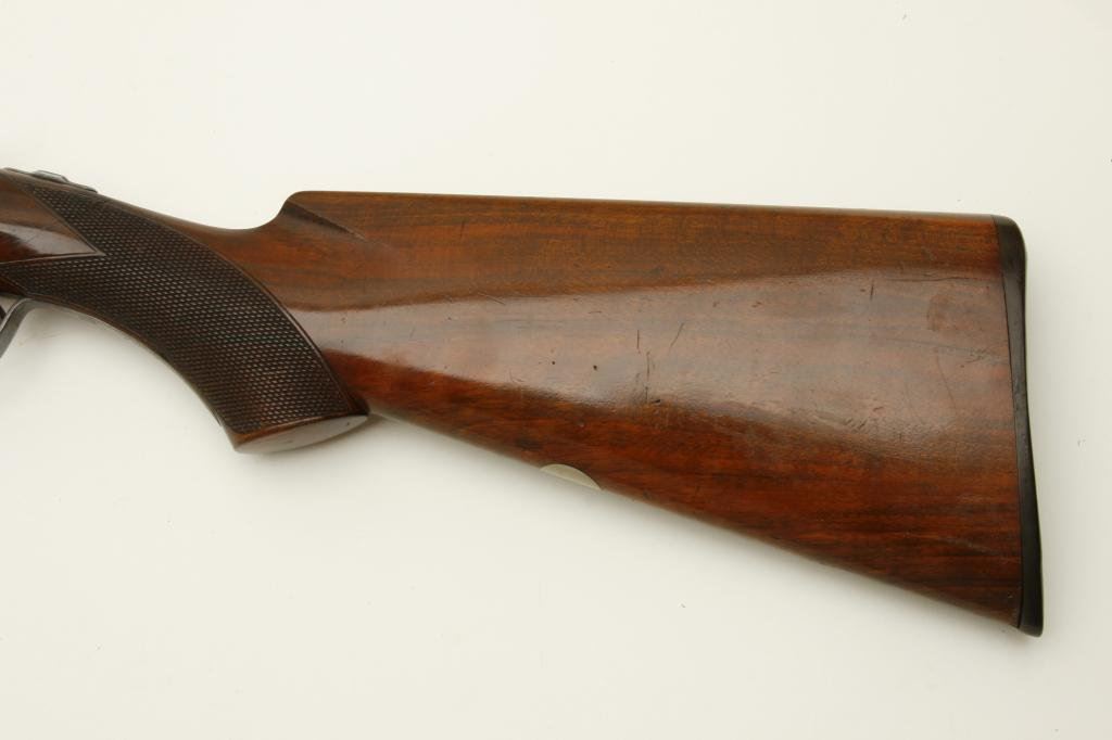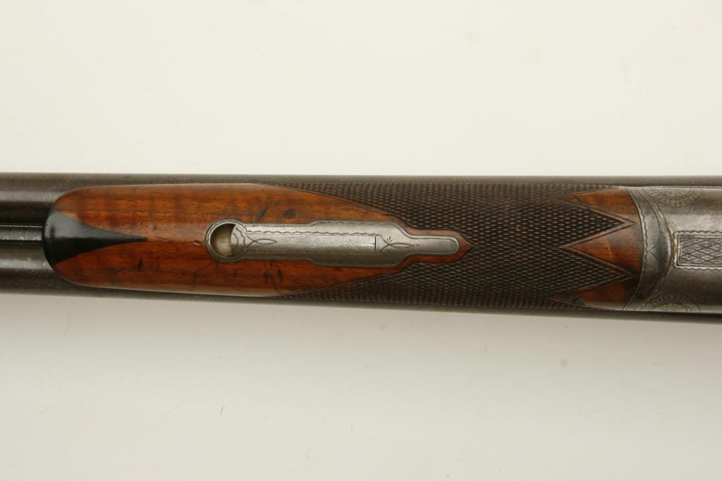 12GA in near fine original condition, S/N 6924 with 30” Damascus barrels showing well defined pattern and normal aging. 50%-60% original case hardening with some light rainbow hues still showing. 50% blue on the trigger guard. Very good plus wood with crisp checkering and minor imperfection. Original hard rubber butt plate. Locks tight with very good bores. An exceptional specimen of which only about 7000 were made. (Antique) Est.: $3000-$6000