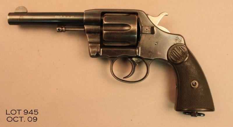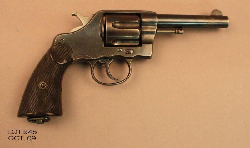 Colt Model 1889 DA revolver, .41 cal., 4-1/2” barrel, blue finish, checkered Colt hard rubber grips, #28809. This gun is in overall very good condition showing approx. 90% original finish, good bore, action, markings and with lanyard ring; the grips are overall good with just a couple of old compressions. Est.: $250-$500.