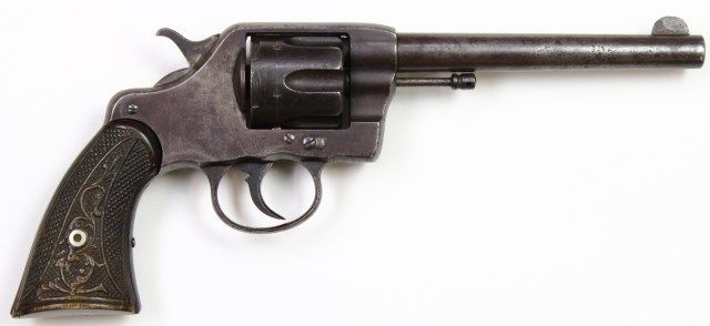 revolver 6" barrel. Natural gray brown patina, scattered pin prick pitting, non original carved grips, left side frame inspector stamped RAC. Good action with fair to good bore. Modern. Est. 300-500