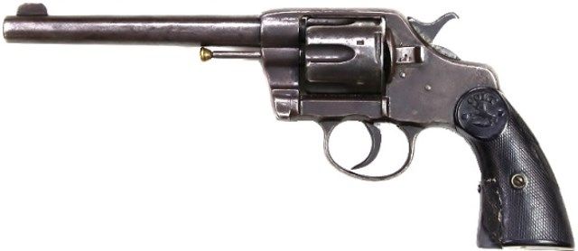 6" barrel, blued finish, hard rubber grips. Barrel with hints of blue in protected areas, remainder silver gray driting brown, left grip with large chip, good action with fair bore. Modern. Est. 300-500