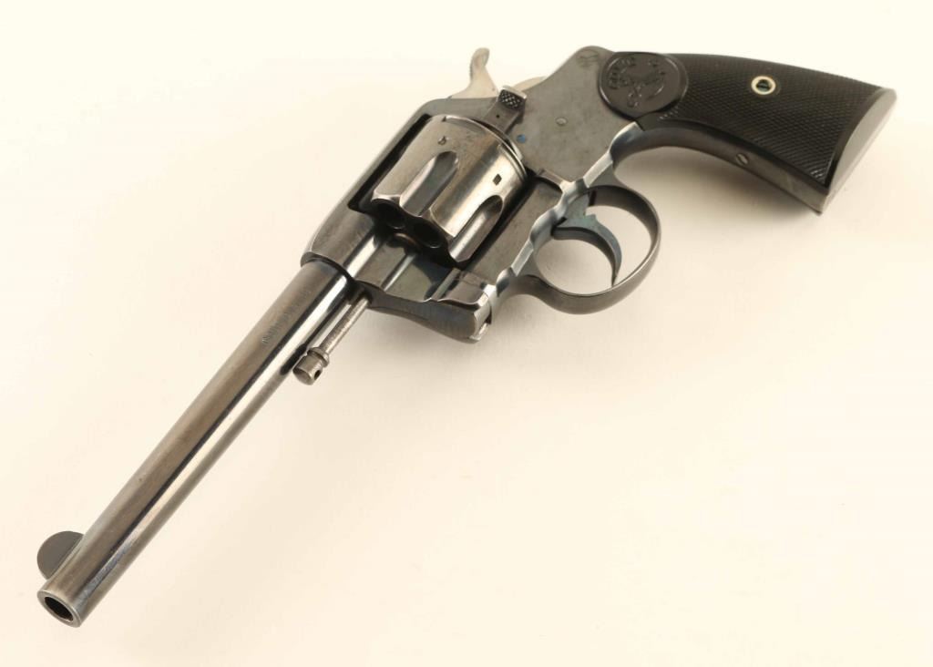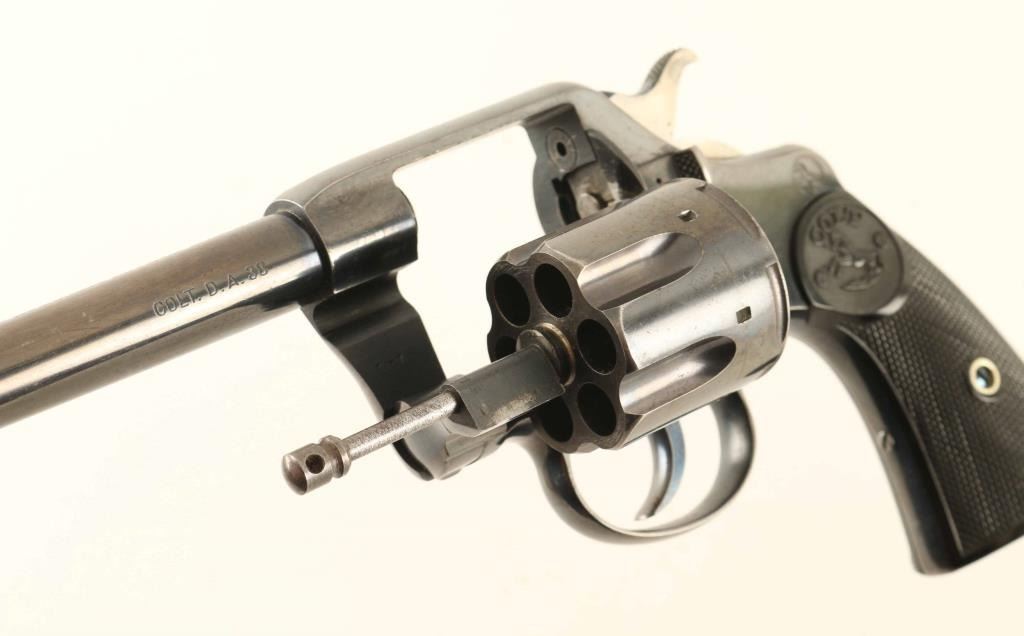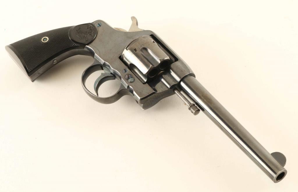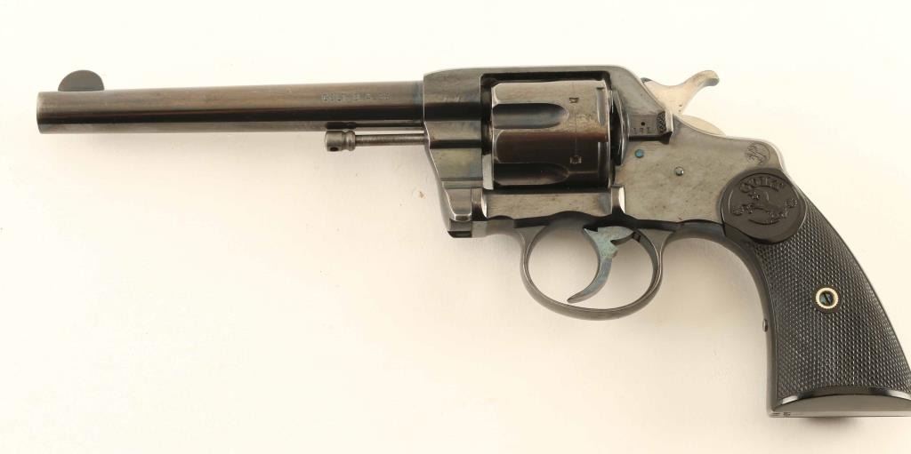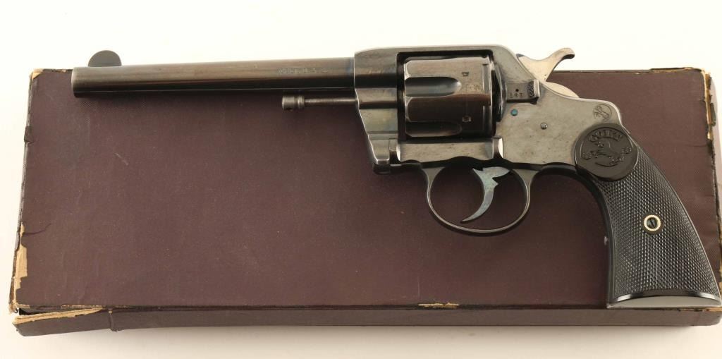 Antique commercial medium frame double-action revolver chambered in .38 Long Colt, manufactured circa 1892. Features a blued finish with niter blued small parts, 6" barrel, round blade front sight, 'u' notched rear sight, non-shrouded ejector rod, fluted swing-out six shot cylinder, smooth trigger, knurled hammer spur and two-piece checkered black hard rubber grips with "COLT" & Rampant Colt decor. Includes a factory maroon cardboard box for a 6" .38 Official Police. Revolver exhibits approximately 70% of it's original blued finish showing edge wear, thinning, scattered losses and some specks of light scattered rust. Action is stiff with solid lock-up, the bore appears pristine, markings are sharp and the hard rubber grips are fine with the assembly number carved into the back of both panels. Condition is NRA Fine. ***Antique Firearm***