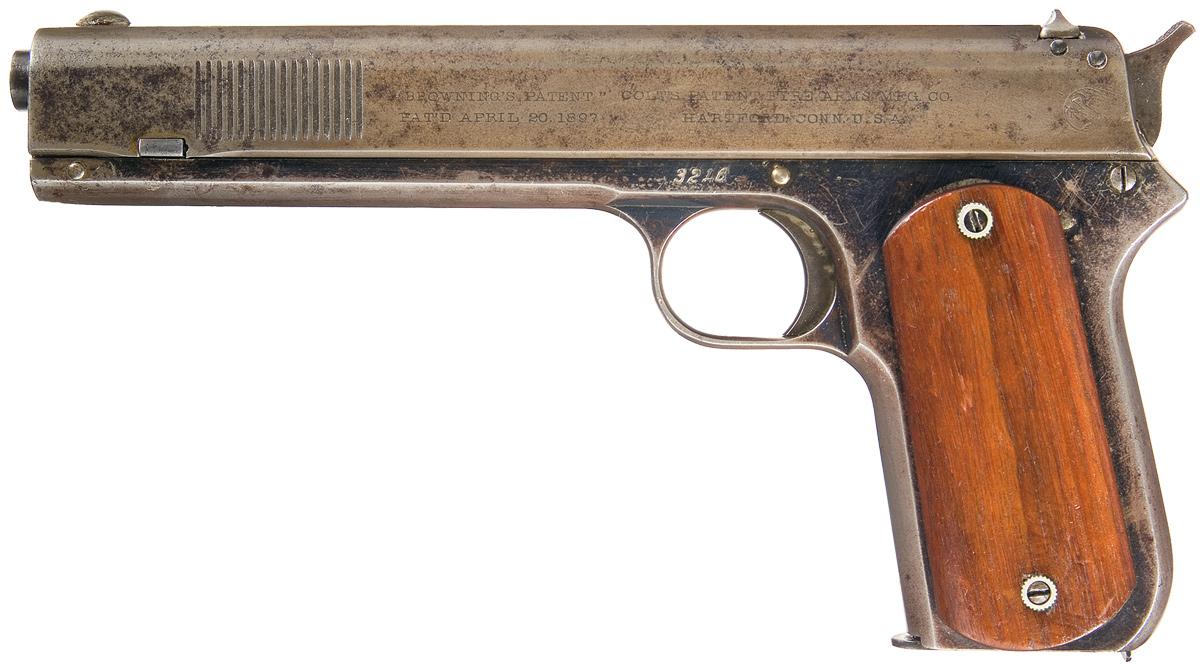 Manufactured in 1902. The sight safety slide has been converted to a fixed notch rear sight configuration and has front grip serrations. The right side of the slide is roll-stamped "AUTOMATIC COLT / CALIBRE 38 RIMLESS SMOKELESS" ahead of the ejection port. The left side of the slide is roll-stamped "BROWNINGS PATENT" / PAT'D APRIL 20. 1897" followed by "COLT'S PATENT FIRE ARMS MFG. CO. / HARTFORD. CONN. U.S.A." with the circled Rampant Colt. Magazine base has the 1884 patent date. Fitted with smooth replacement walnut grips.