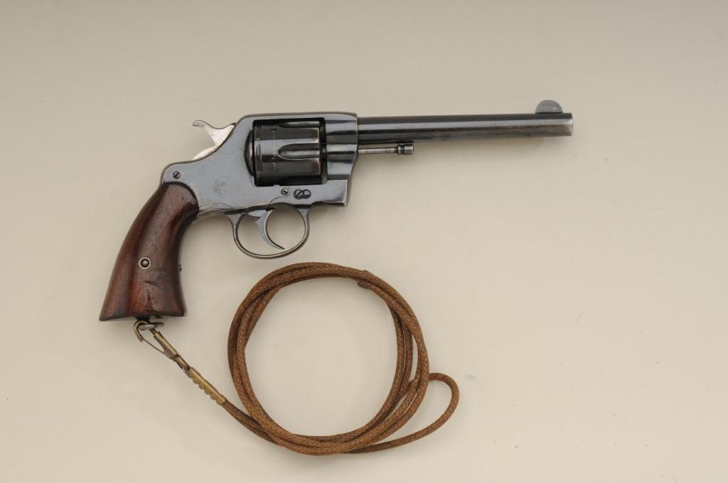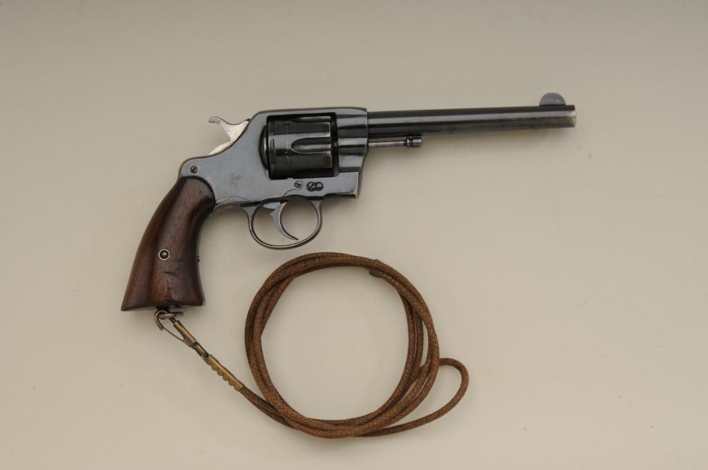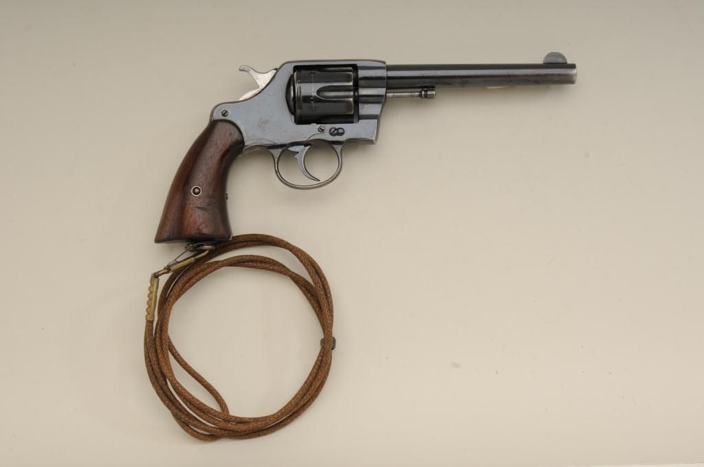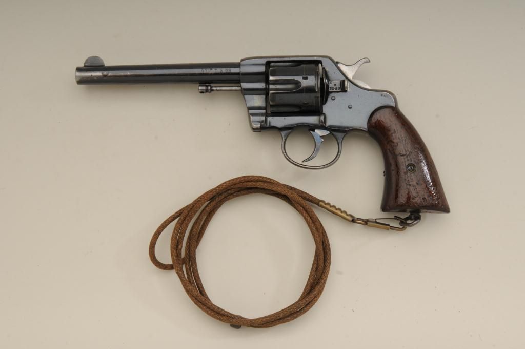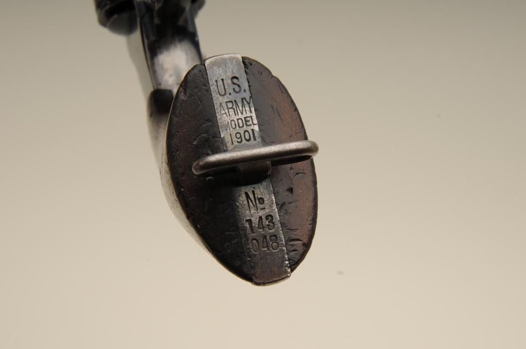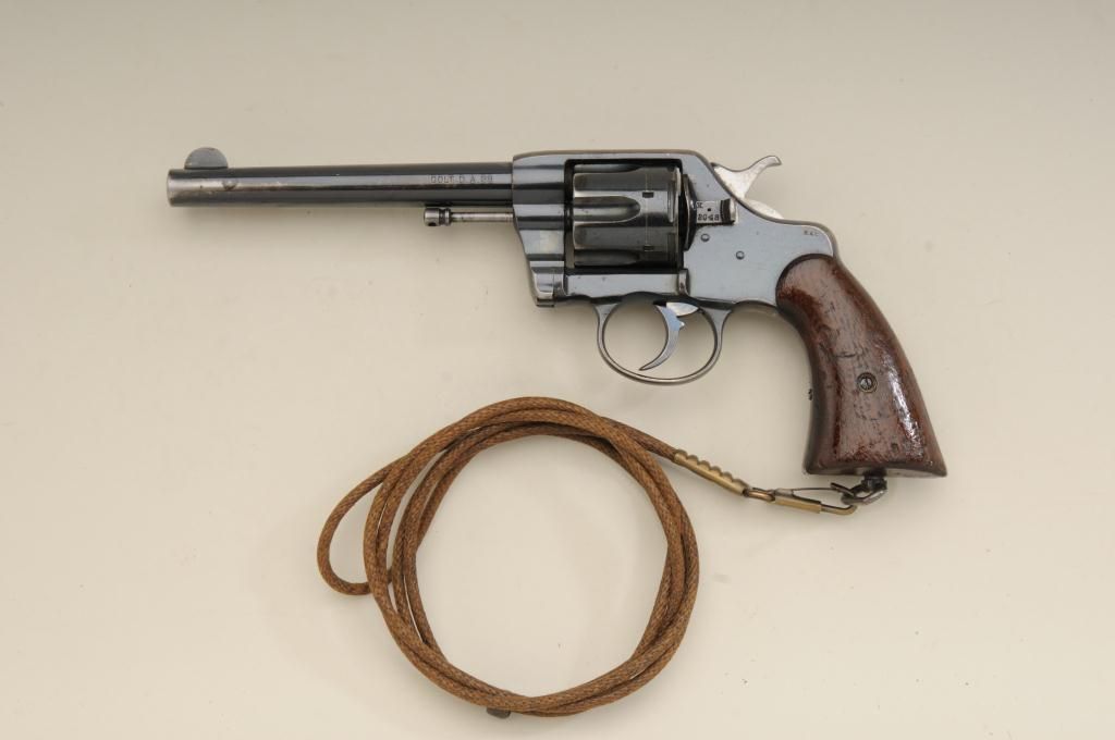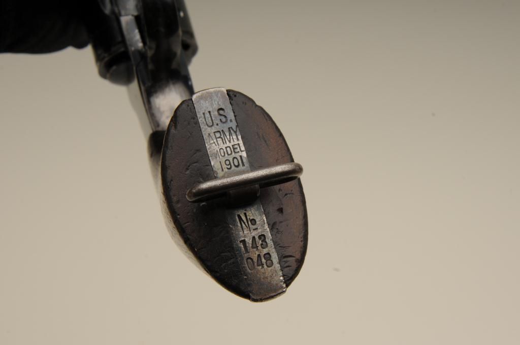 Colt Model 1901 .38 caliber U.S. Martial marked double action revolver inspected by R.A.C. in very good original condition, serial number 143048. This Colt retains 70% to 80% original bright blue which is drifting at the edges, grip straps and muzzle. The markings are sharp. The grips are good to very good with some minor marks, wear at the edges and some distress at bottom of grips. The right grip shows a R.A.C. inspectionstamp on bottom. The side plate is raised up slightly and is not screwed down all the way. The action is good and the bore is bright. The front sight is full original height. Est.: $600-$1,200.