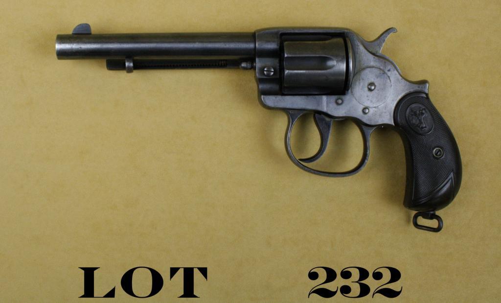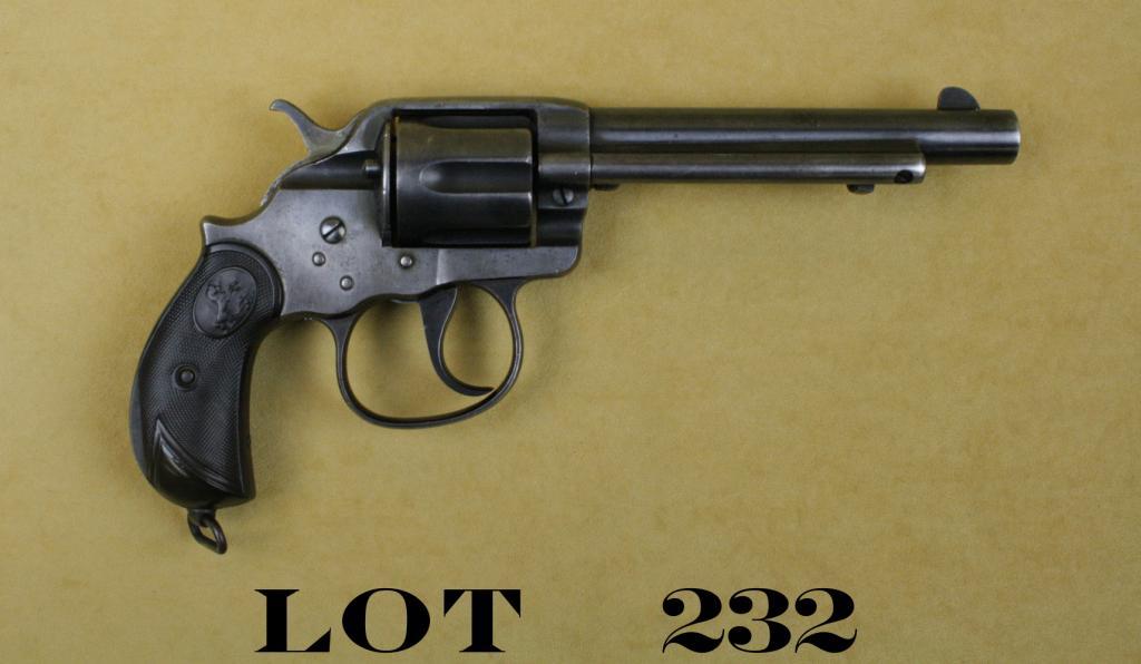 Colt Model 1902 DA revolver, U.S. marked and R.A.C. inspected (aka “Philippine Model”), .45 cal., 6” round barrel, blue finish, checkered hard rubber grips, #45770. This gun is in overall good condition showing an oldcleaning or quality old re-blue with approx. 80% of that finish remaining with some scattered areas of erosion and pin prick pitting, good bore, action and markings; grips are overall fair + with an old loss tothe lower back portion of the right grip; some original niter blue remaining on the trigger. Est.: $600-$1,200.