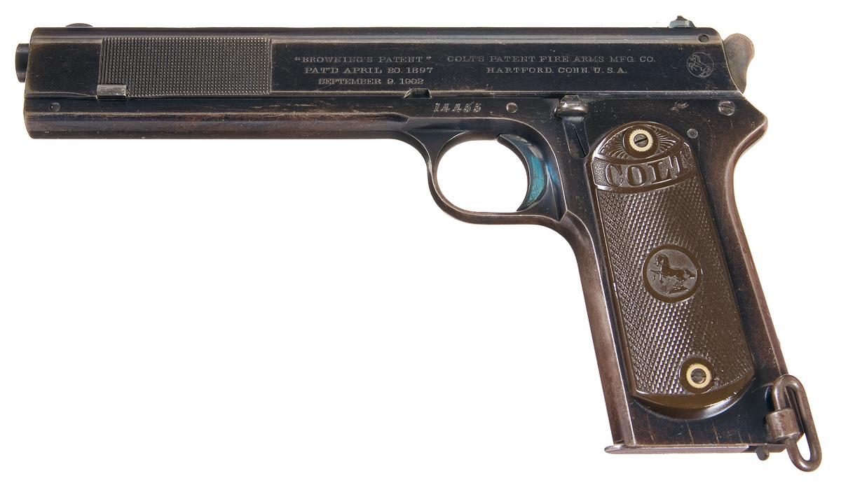 Manufactured in 1903. Fixed sights, with the checkered panels on the front of the slide, "PATENTED/ APR.20.1897. SEPT.9. 1902" followed by "COLT'S PT.F.A.MFG.CO./HARTFORD, CT.U.S.A." on the left side and "AUTOMATIC COLT/CALIBRE 38 RIMLESS SMOKELESS" and "MODEL 1902" on the right. Fitted with a checkered round spur hammer, left side slide catch, niter blue trigger and squared butt with a lanyard ring on one side. Checkered hard rubber grips, with "COLT" banners at the top and Rampant Colt imprints in the center.