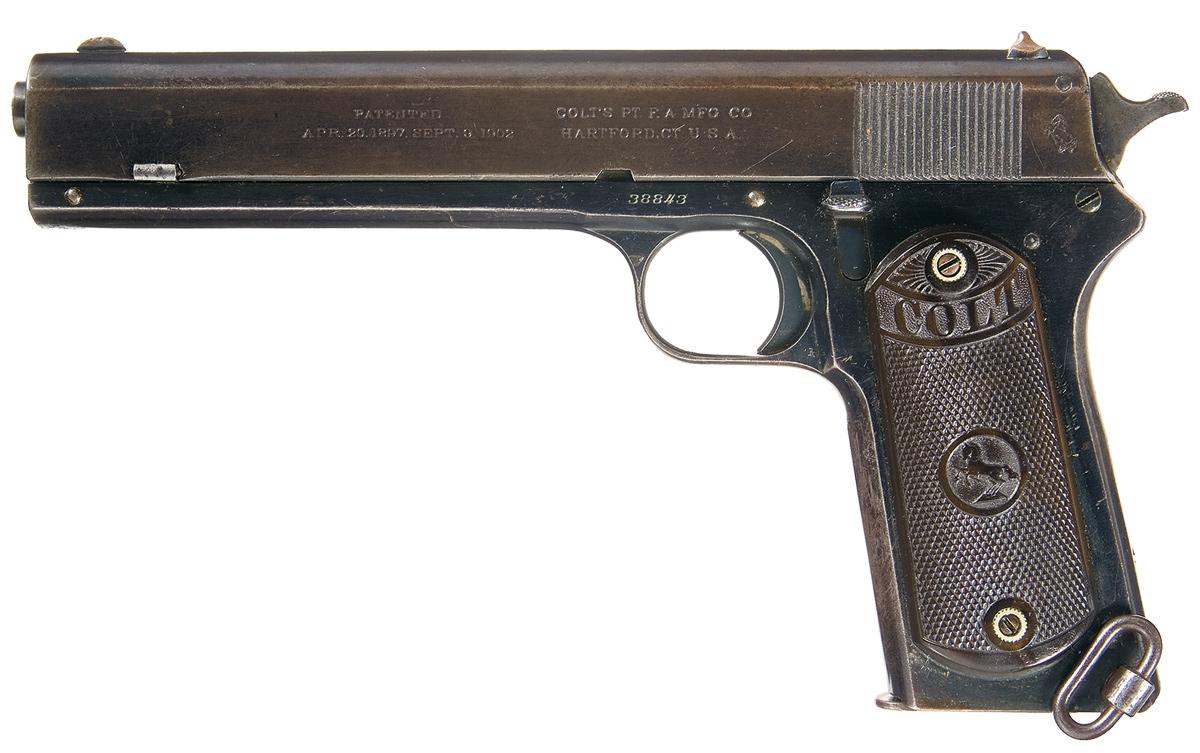 Manufactured in 1916. This pistol has the square butt, slide lock on the left side of the slide, lanyard swivel and eight-round magazine. Features rear slide serrations, barrel polished at the chamber and muzzle and unmarked blue magazine. Left side of the slide is roll stamped with the standard two block, two line patent dates and Hartford address, with the Rampant Colt behind the serrations. Standard two line caliber markings on the right side of the slide. The left side of the trigger guard bow is stamped with a "1" assembler's mark on the lower rear and the Colt "VP/triangle" proofmark on the front top. Fitted with checkered hard rubber grips with "COLT" in a banner at the top and the Rampant Colt in a circle in the center.