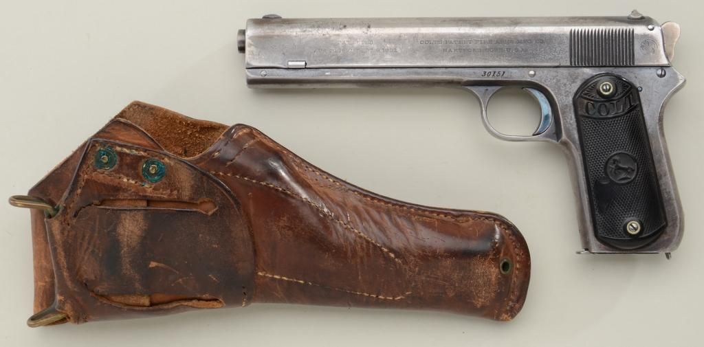 Colt Model 1902 Sporter semi-auto pistol, .38  cal., 6” barrel, blue finish, checkered  black hard rubber grips, #30151. This gun is  in overall good to very good condition  showing traces of original blue in protectedareas with strong traces of niter blue finish  to trigger, good bore, action, markings and  overall good grips showing even wear from  carry; accompanied by a period modified US  military flap holster that appears to havebeen with this gun for some time.  Est.:   $500-$1,000.
