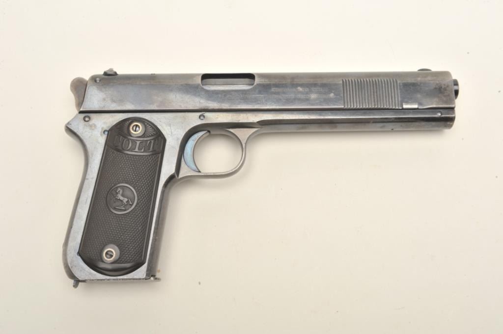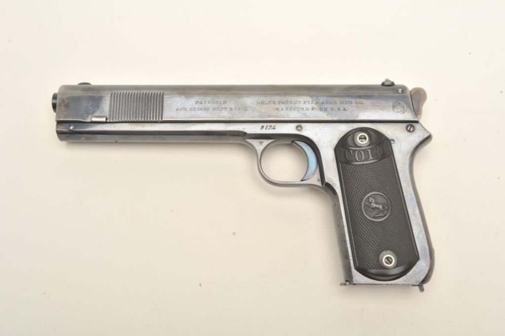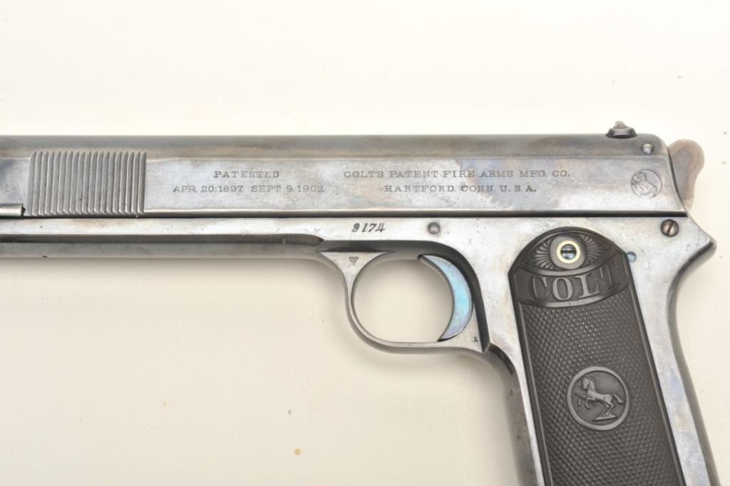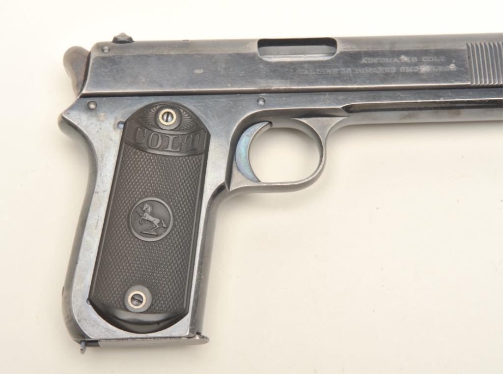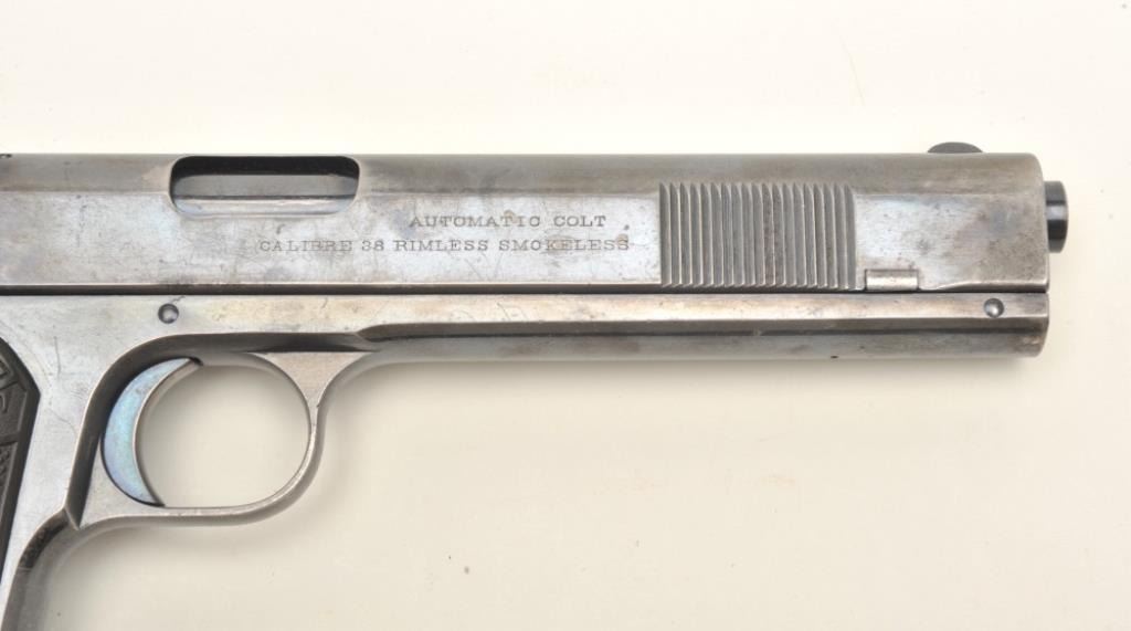 Colt Model 1902 Sporting semi-automatic pistol (ca. 1906), .38 Rimless Smokeless caliber, 6” barrel, serrations on front section of slide, blued finish, checkered hard rubber grips, S/N 9174, in overall finecondition displaying the majority of its original finish with some high point wear and thinning of blue at muzzle; crisp action and markings, fine bore and fine grips. Per Flayderman’s Guide (5B-220), approximately7,500 manufactured between 1903-1908. (C&R/PPT). Est.: $1,500-$3,000.