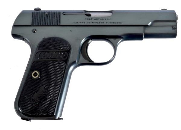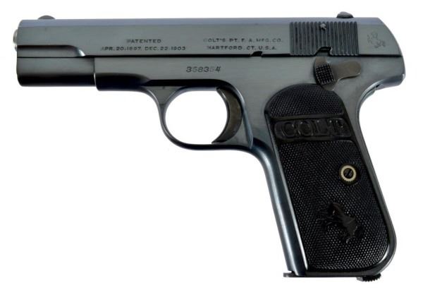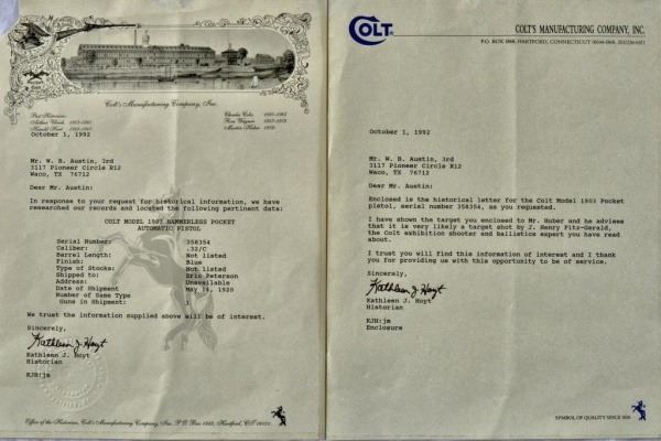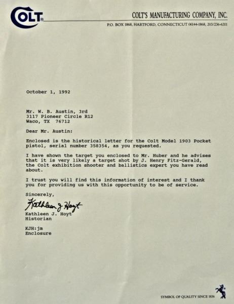 * With factory letter. Few people have had more of an impact on the modern handgun than J. Henry Fitzgerald or "Fitz" as he is commonly referred to. An innovator and master gunsmith perhaps known mostly for his famous cut-away trigger guards. This particular 1903 Colt is truly one of a kind. For his friends, "Fitz" would actually hand pick the best Colt pistols, this would include firing them. This 1903 not only comes with a rare factory box, factory inserts and factory letter, it has the original factory target signed by "Fitz" personally. The Colt factory was so impressed, they actually sent a letter on the target.