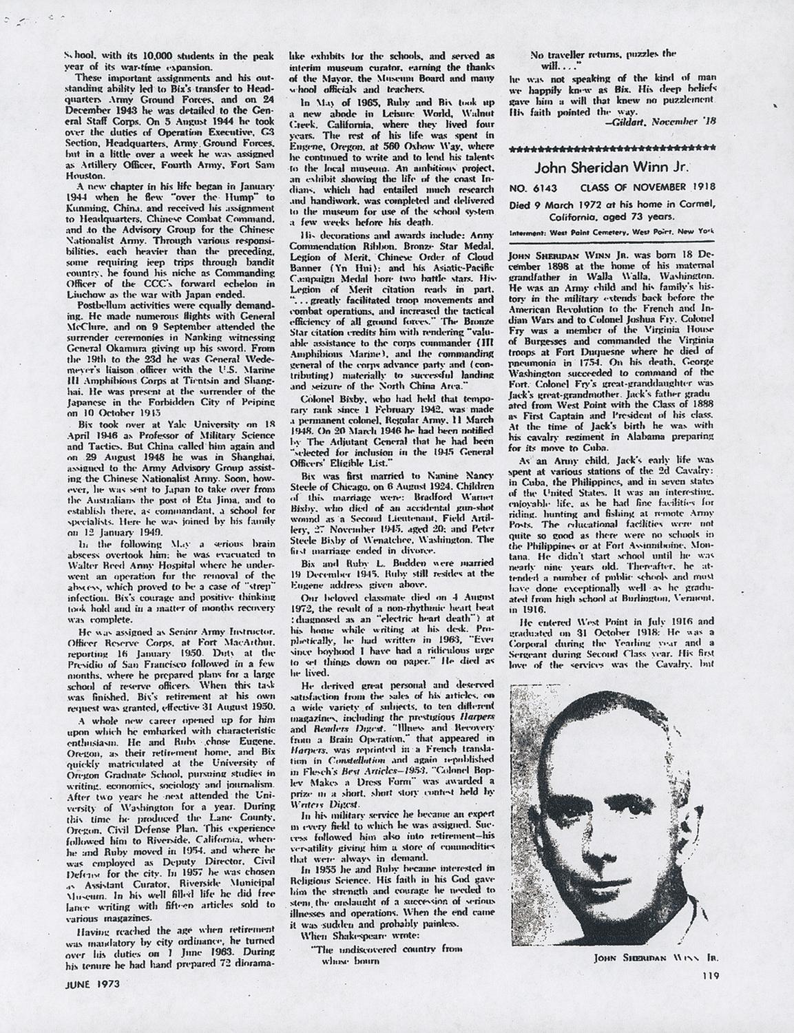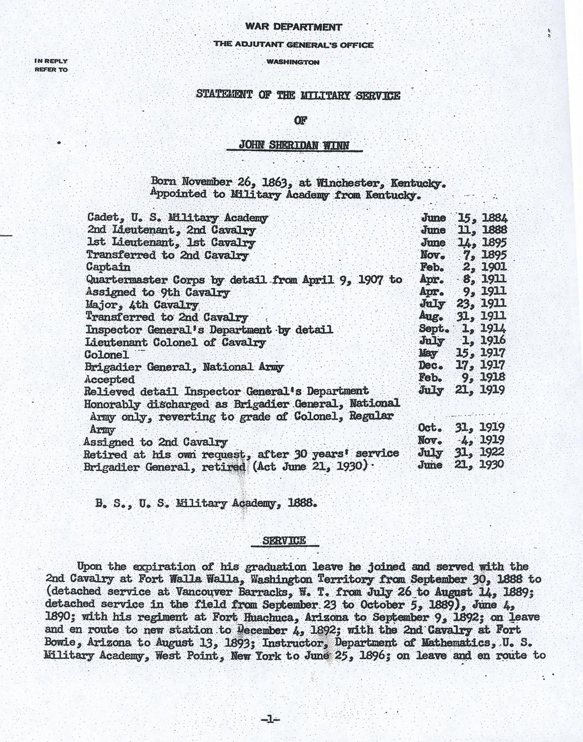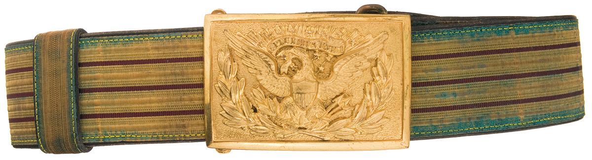 Colt Model 1903, .32 ACP Semi-Automatic Pistol manufactured in 1919. This pistol was the personal firearm of General John Sheridan Winn. General Winn graduated from West Point in October 1918 was promoted to Brigadier General in 1944. The pistol is accompanied by General Winn's gold bullion saber belt with gold-plated buckle with applied eagle and wreath. The pistol has the Colt commercial blue finish with bright barrel chamber. The black, hard rubber, stocks are checkered with "COLT" in a ribbon at the top and Rampant Colt trademark in relief on the lower portion. The pistol is complete with a full blue .32 ACP magazine marked: "CAL.32/COLT" on the bottom of the floor plate. The pistol has the early, rounded rear sight and half moon front sight. The right side of the slide is roll-stamped "COLT AUTOMATIC/CALIBRE 32 RIMLESS SMOKELESS". The left side of the slide is marked "PATENTED /APR.20,DEC.22, 1903" in a two line block followed by "COLT"S PT.F.A.MFG.CO./HARTFORD, CT. U.S.A." in two lines. The Rampant Colt trademark is roll-stamped on the left side of the slide behind the serrations. The serial number, "323078" is located on the left side of the slide above the trigger. An "R" assembler's mark is stamped above the Colt "triangle/VP" proofmark on the left side of the trigger guard bow. This is not a general officer issue Colt Model 1903 Pocket Hammerless but is the personal handgun of an Army officer who was promoted to general during WWII.