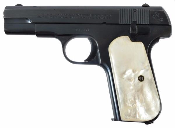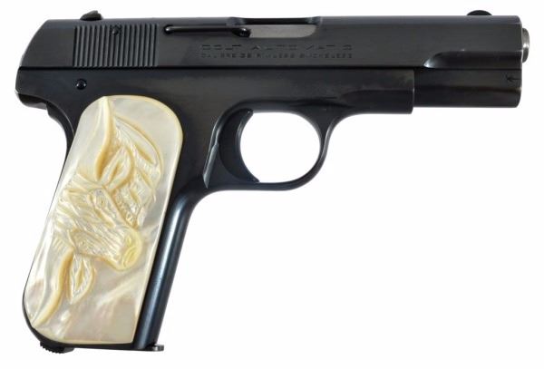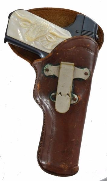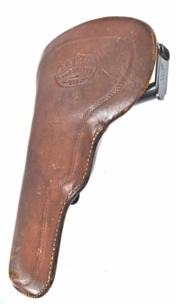 * Serial no. 407031 .32 in excellent condition retaining over 95%+ of original blue finish with carved steer head mother of pearl grips. in a marked nicely marked SD Meyers Sweetwater Texas holster.