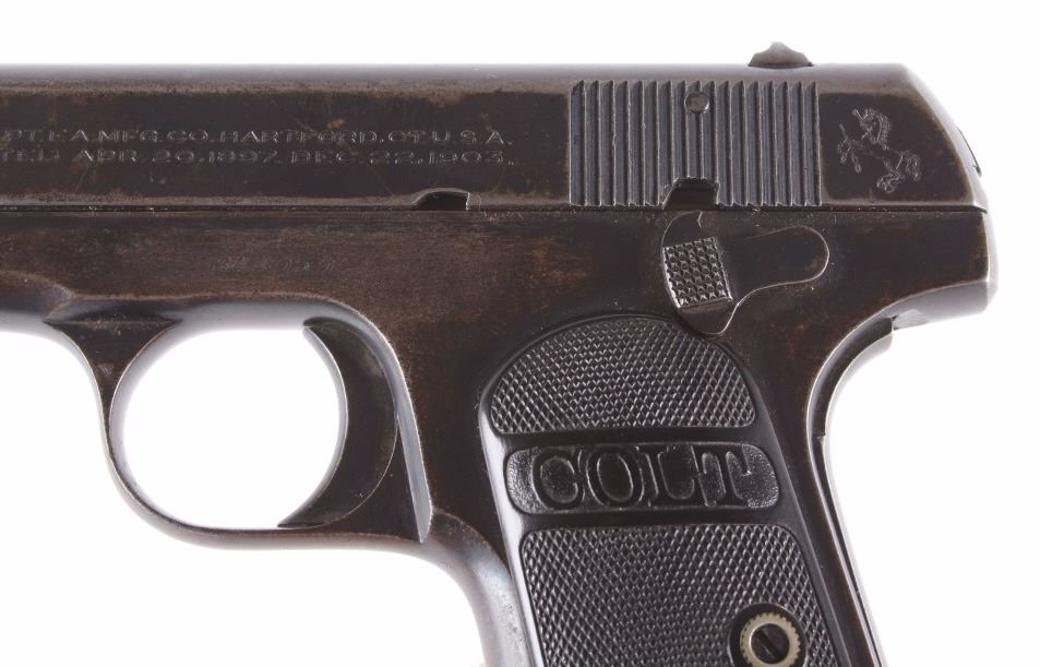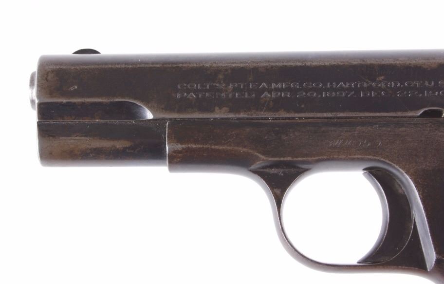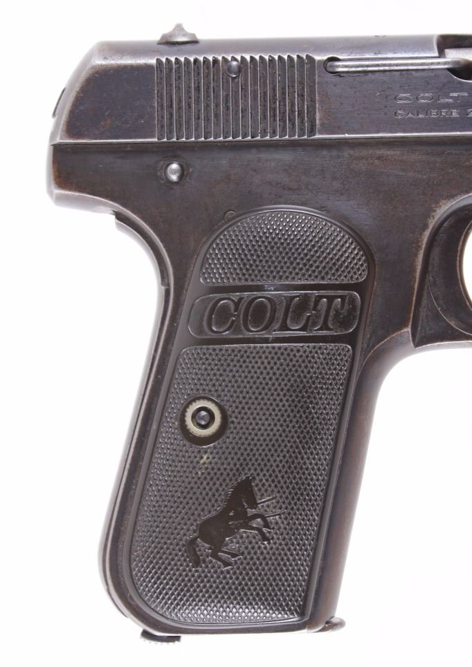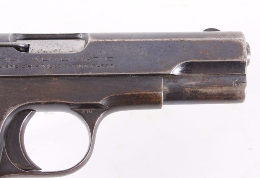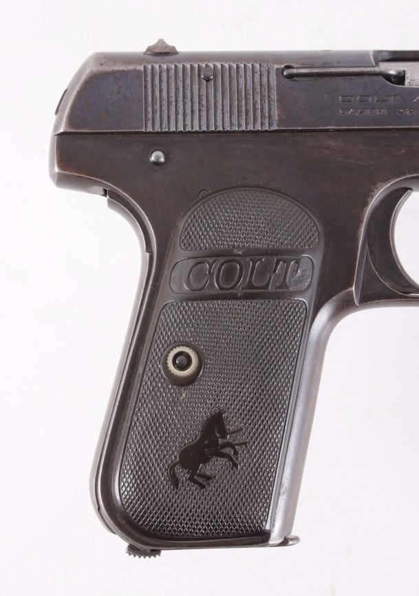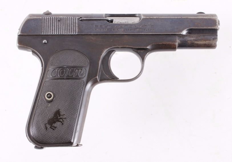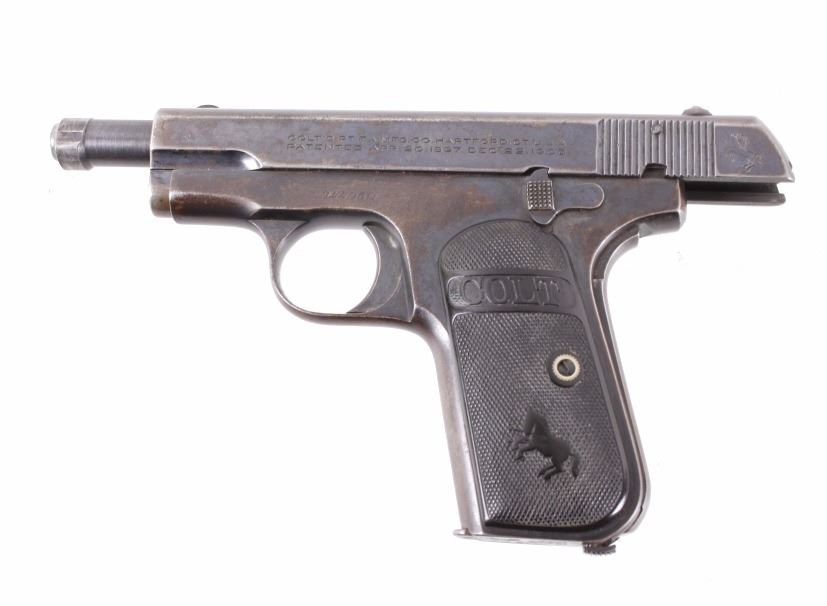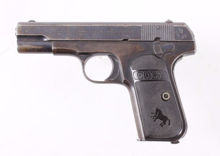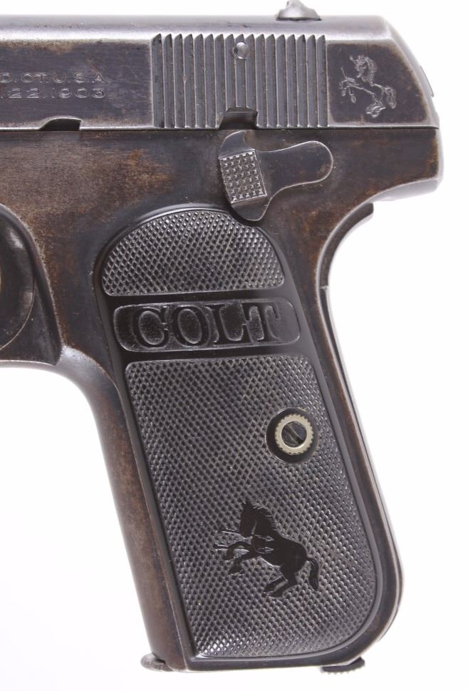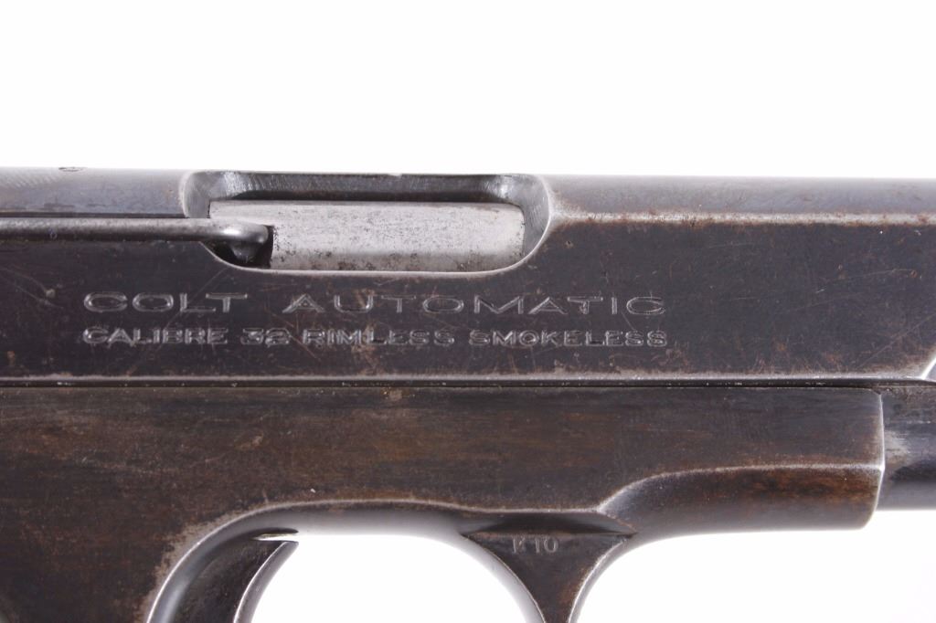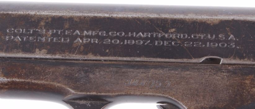 This is a Colt Model 1903 semi-automatic pistol chambered in the .32 caliber manufactured in 1909. The pistol features a blued finish with the original checkered grips marked "Colt" showing the early emblem. A majority of the blue finish is still on the barrel. The slide is marked "Colt's Pt. F.A. Mfg. Co. Hartford, Conn. U.S.A." and "Automatic Colt Calibre 32 Rimless Smokeless". The pistol comes with two magazines, one of which is marked "Cal. 32 Colt". The Colt Model 1903 pistol is in good overall condition. It measures 4.25" x 6.75". Serial number is 344050 and was manufactured in 1920. This firearm requires a Curio & Relic FFL, FFL or NICS background check for transfer.