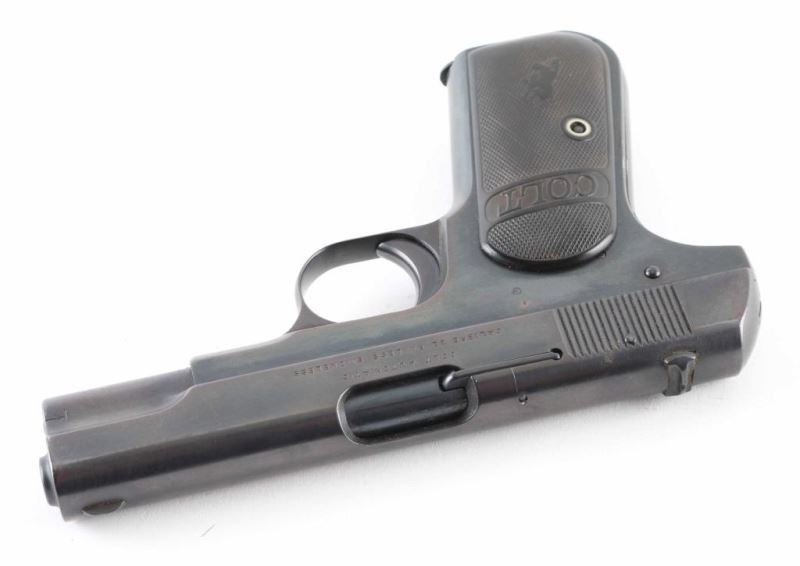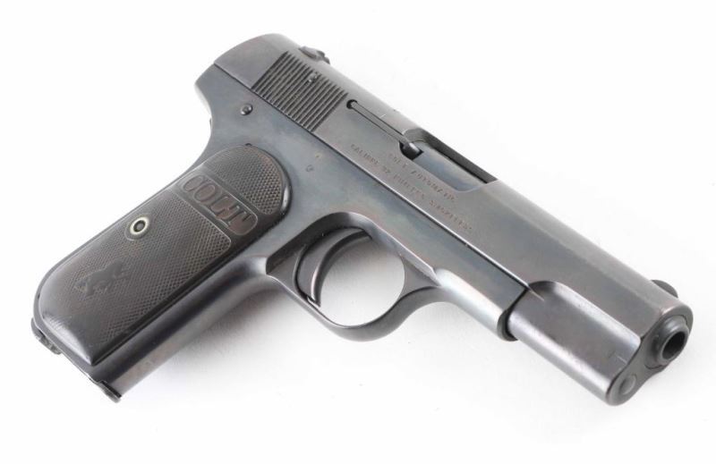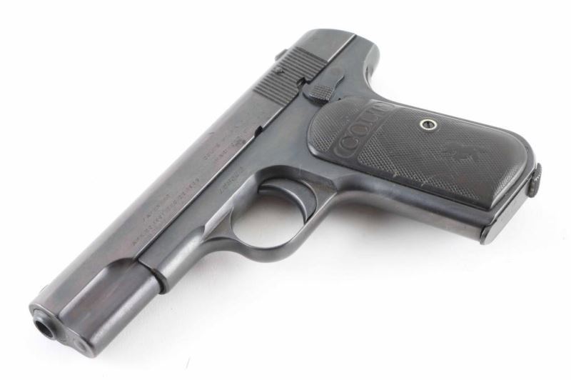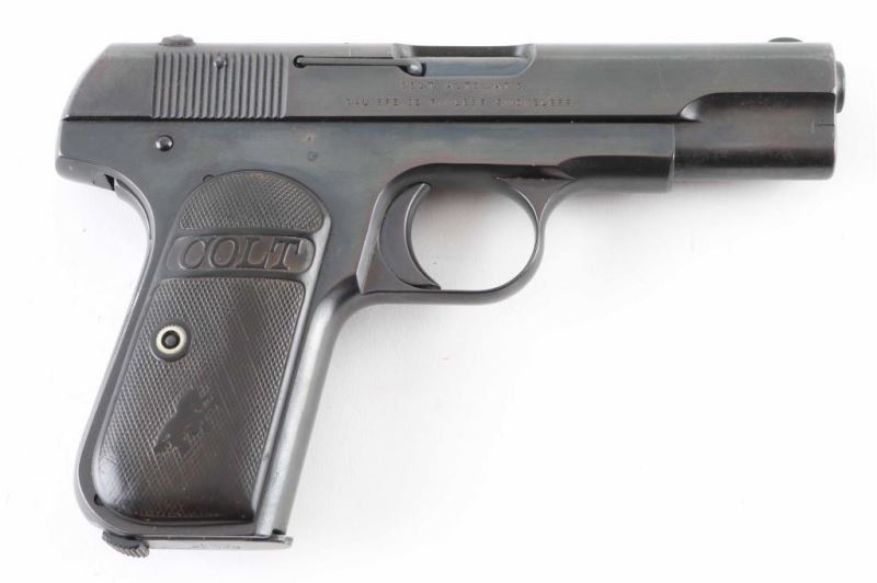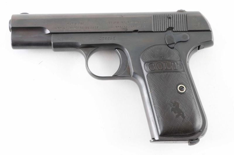 Pistol. Semi-Automatic. 8-rd magazine. Manufactured 1914. Produced 1903-1945. Blowback, single-action. 3.75" barrel. Slide mounted front blade, rear notch sights. Grip safety. Colt Address, Patent Dates, and "Rampant Colt" on left slide. Serial number on left frame. 2-line "Colt Automatic Calibre 32 Rimless Smokeless" on right slide. Slide action is smooth/tight. Bore is a little rough, but has strong rifling. Blued finish has dulled somewhat. Some very minor rust spots. Checkered hard rubber "Rampant Colt" are worn smooth in places, but not bad. Comes with correct magazine marked "Cal.32 Colt". NRA Condition- Good Plus. C&R Firearm.