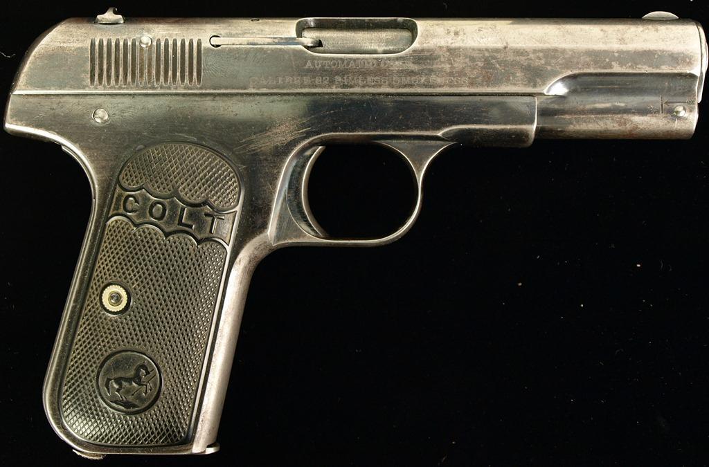 semi auto pistol, blue finish, Colt hard rubber checkered grips. Good overall condition, 40-50% original blue remains, slide left side marked "Brownings Patent", pat'd April 20, 1897. Good grip, original clip intact, smooth action, nice bore. FFL required.