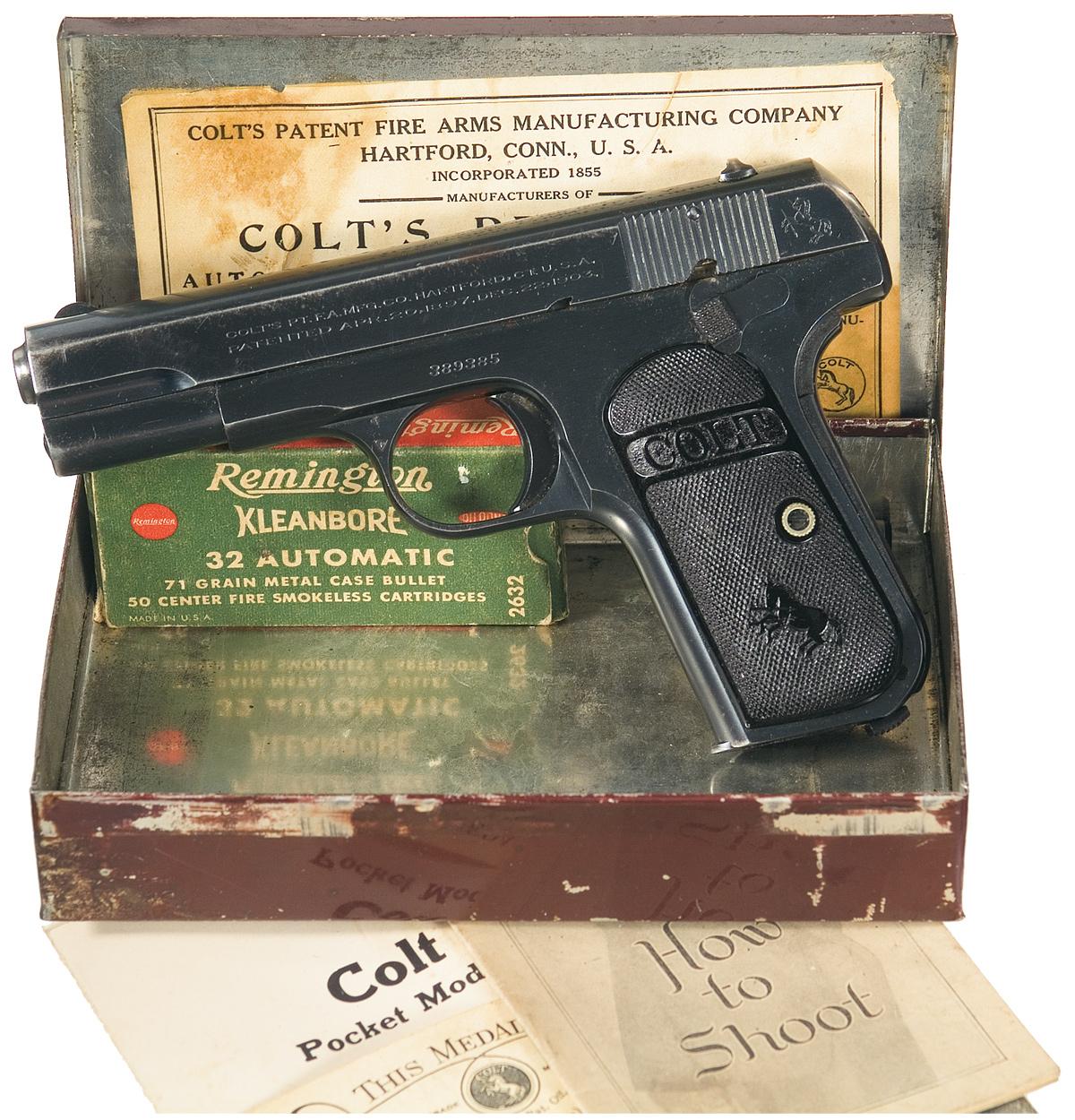 Manufactured in 1921. Fixed sights, with the two line address/patent dates (1897, 1903) on the left side of the slide with the Rampant Colt behind the serrations, and "COLT AUTOMATIC / CALIBRE 32 RIMLESS SMOKELESS" on the reverse below the ejection port. "R / VP" on the front upper left side of the trigger guard and "60" on the reverse. Fitted with checkered Colt banner and Rampant Colt embossed grips. Included are the following: a box of Remington .32 ACP ammunition, a Colt "How to Shoot" booklet, instructions, and a red tin box with Colt box labels adhered to a short side (.32 automatic pistol label) and the inside of the lid (Colt manufacturer label on inside of lid).