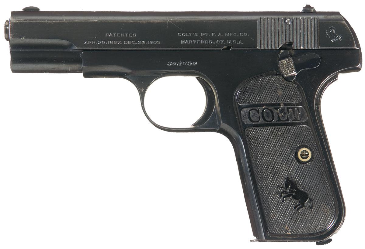 Manufactured in 1919, the left side of the slide is marked with "PATENTED/ APR. 20, 1897, DEC. 22, 1903" and in a second block "COLT'S PT. F. A. MFG. CO. / HARTFORD. CT. U.S.A." with the Rampant Colt behind the slide serrations. The right side of the slide is marked, "COLT AUTOMATIC / CALIBRE 32 RIMLESS SMOKELESS" in two lines below the ejection port. Fixed sights, high polished blue slide and frame, blued barrel, checkered black plastic grips with "COLT" banner at the top and the Rampant Colt on the bottom on each grip. Complete with a two tone magazine marked "CAL. 32/ COLT" and a suede Bianche belt clip on holster.