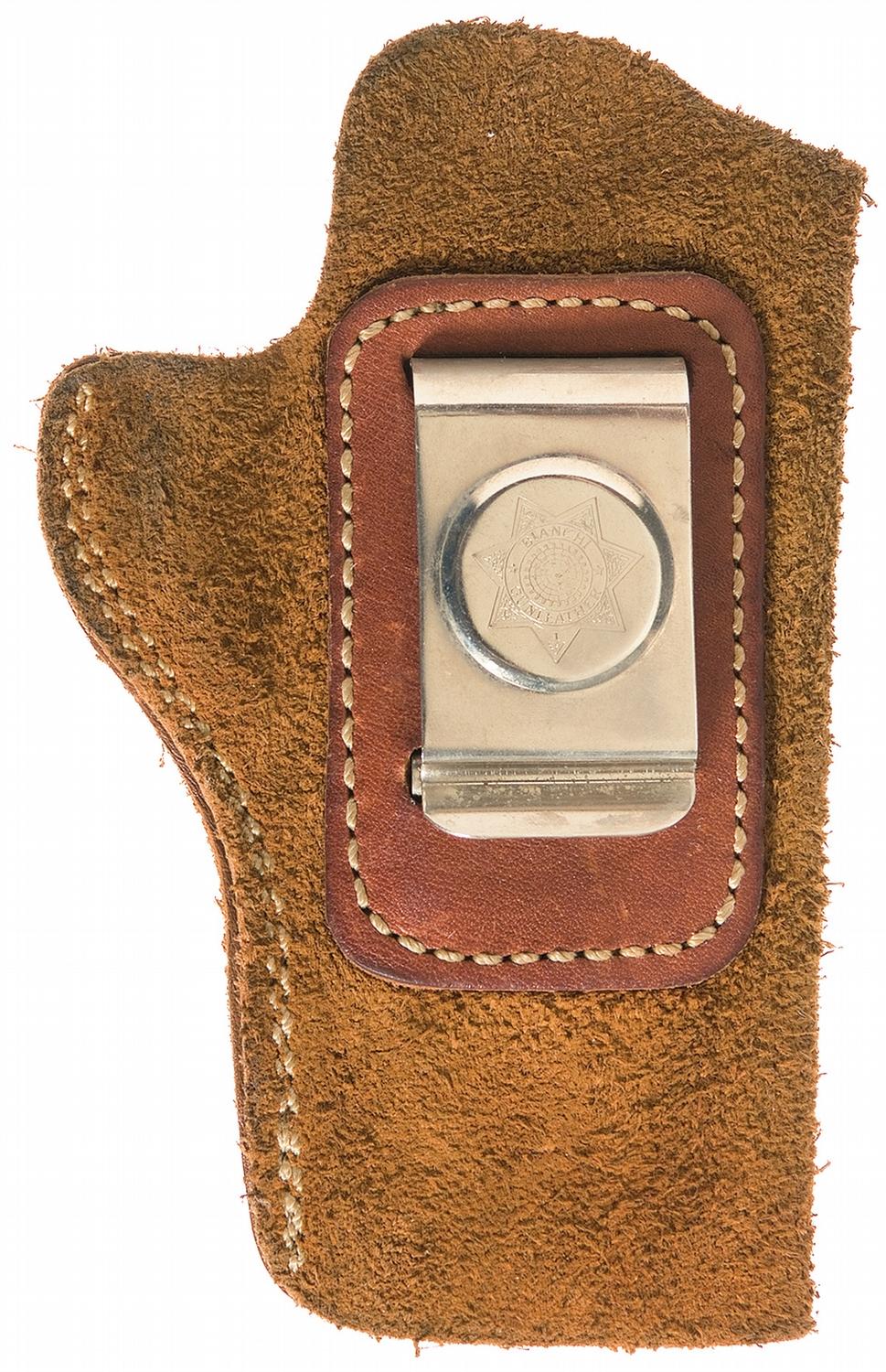 Condition: Excellent with 95% of the original blue finish remaining. High edge wear is present on the slide and frame, a little heavier on the left side of the slide, with mild spotting behind the right grip panel and on the lower right portion of the slide behind the serrations. The backstrap has a smooth mottled brown patina and the front grip strap has some thinning. Light scratches on portions of the frame and slide. The grips are very good with a couple of pressure dents and nicks in the left panel with crisp checkering. The markings are crisp and clear. The holster is good.
