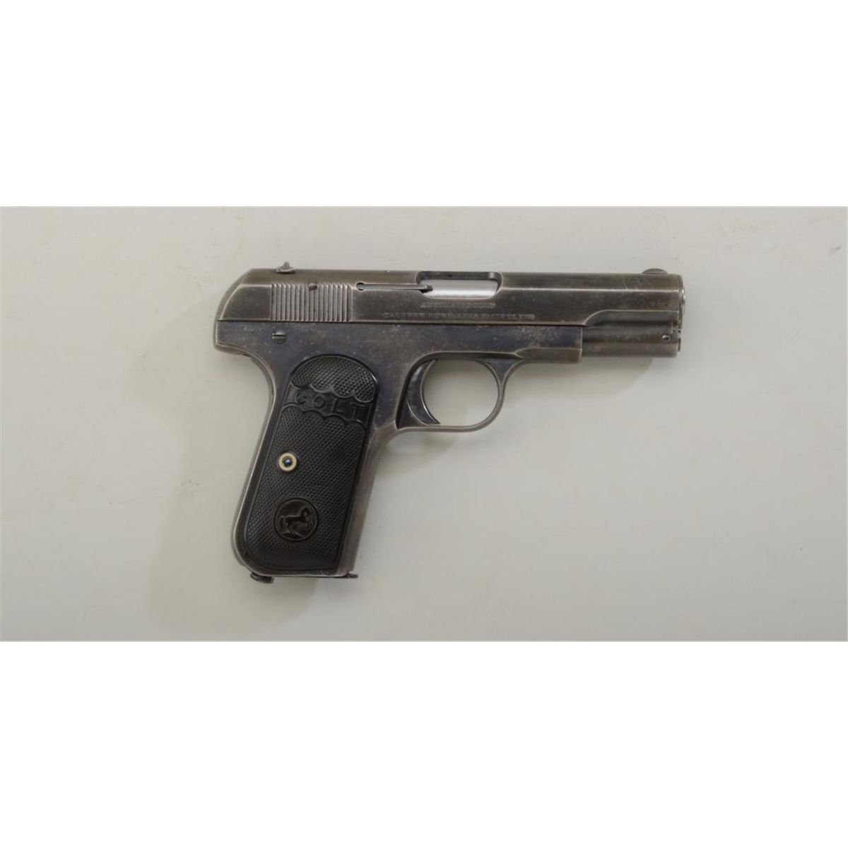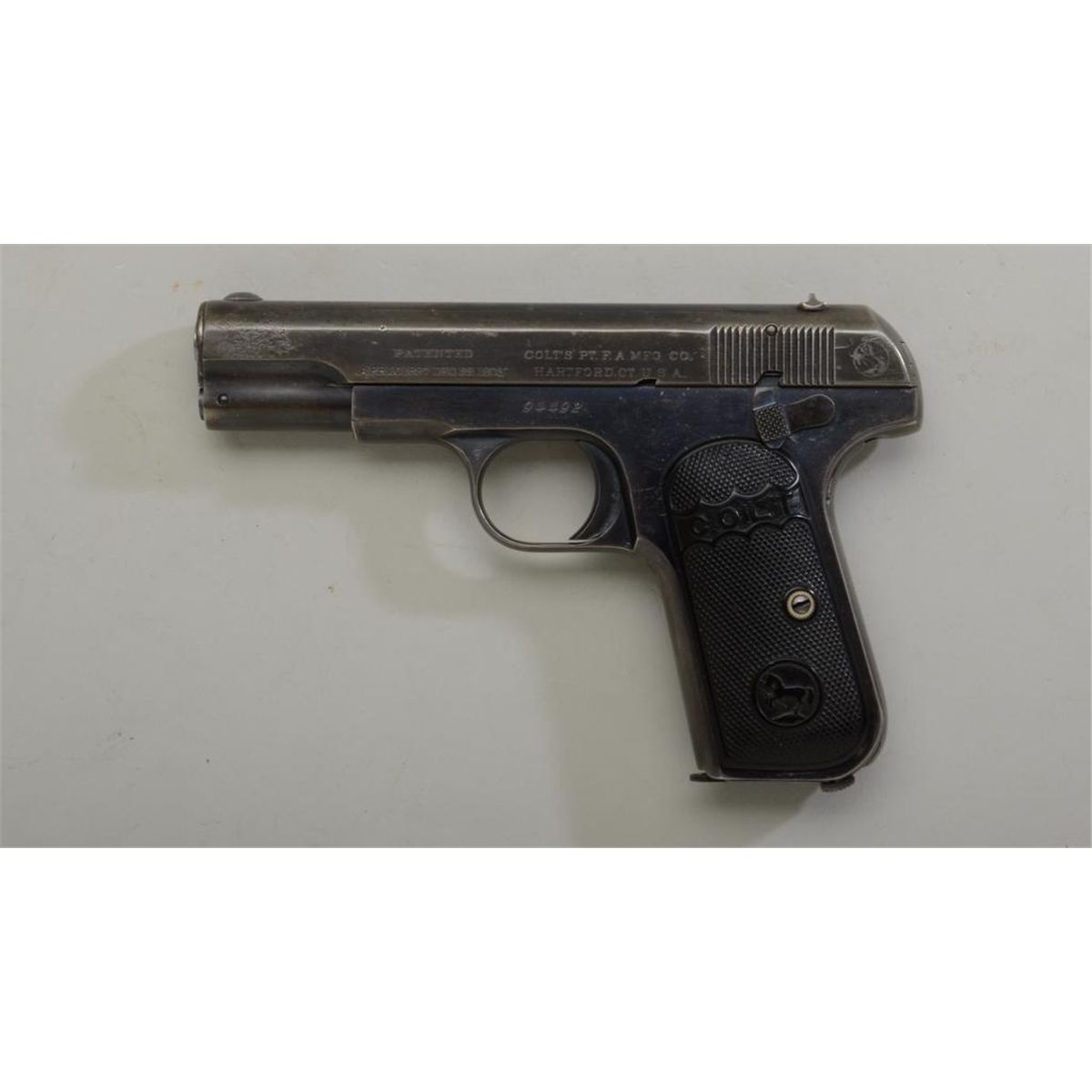 Colt Model 1903 Hammerless semi-auto pistol with early barrel bushing, .32 cal., 3-3/4” barrel, blue finish, early checkered Colt black hard rubber grips, #94492. This gun is in overall fine condition showing approx. 40% original blue finish, fine bore, crisp action, very good markings, an area of old pitting on the left side of the slide at the muzzle; grips are overall very good, correct two-tone magazine. Est.: $400-$800.