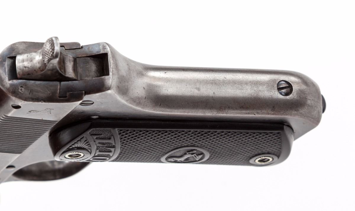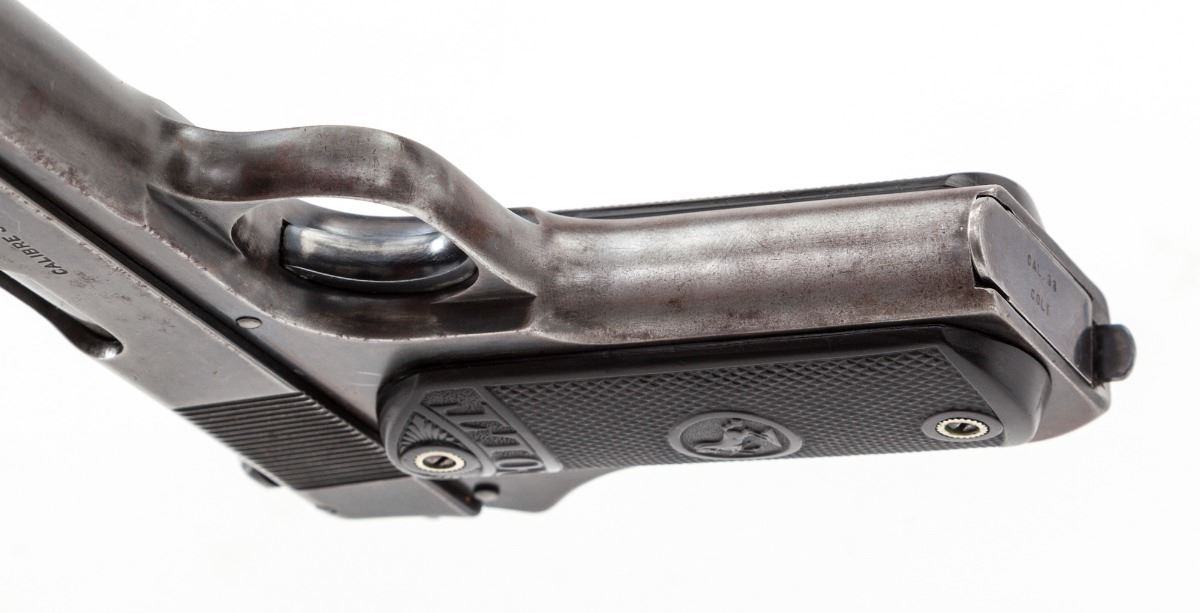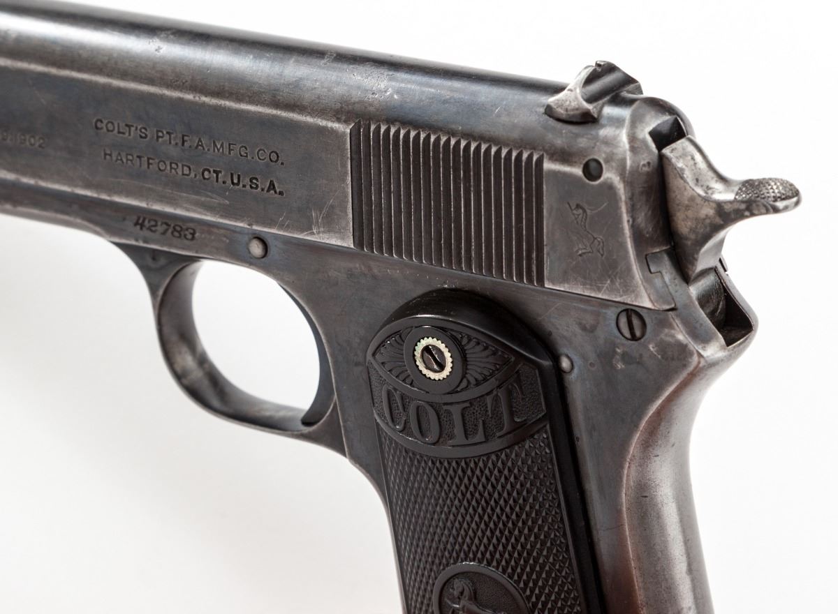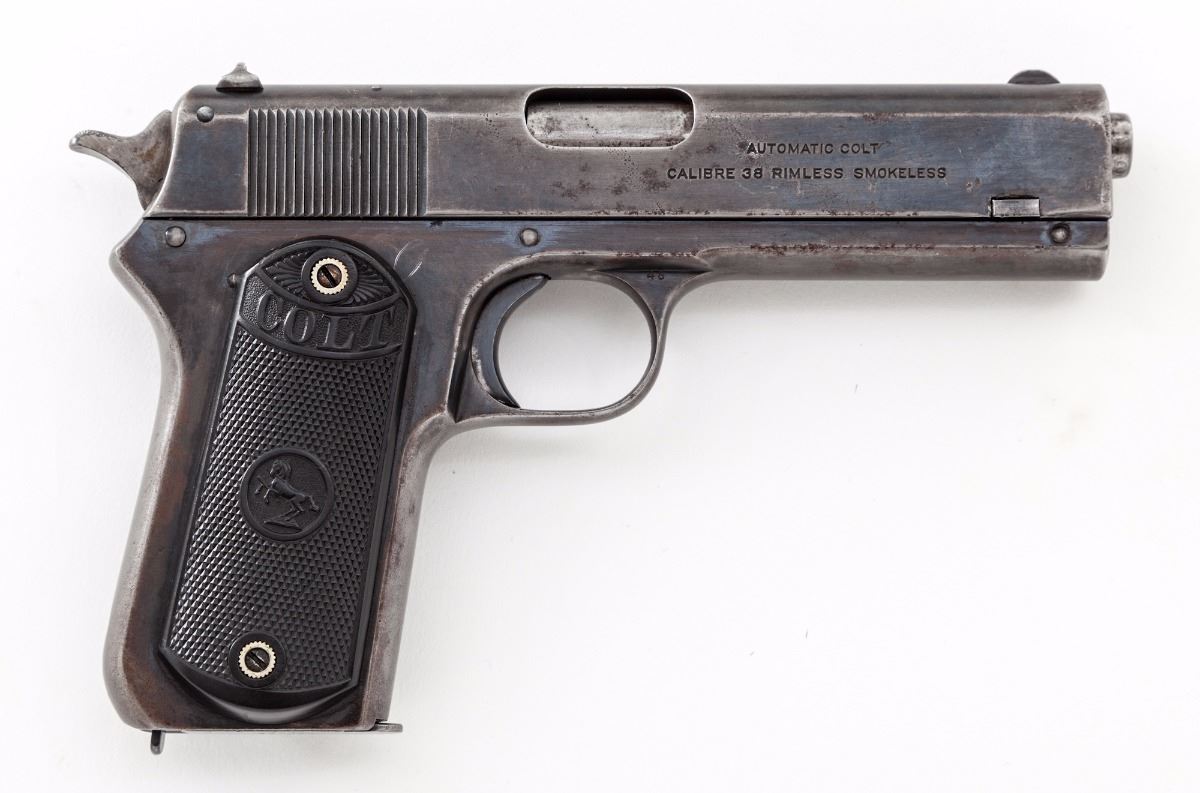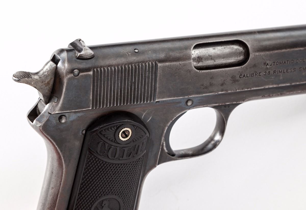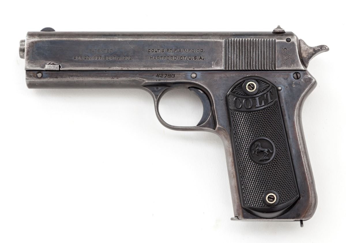 Colt Model 1903 Pocket Hammer Semi-Automatic Pistol, #42783, .38 ACP cal., 4-1/2'' barrel. blue finish, checkered hard rubber grips, with full blue magazine marked ''Cal .38/Colt''. Receiver is numbered to the slide. Mfg'd 1920. Condition is very good retaining approx. 40%-50% original factory blue with the balance turned to brown patina showing scattered freckling and minor pits overall. Grips are excellent with little wear and no cracks or chips. Action is tight, bore is strong with light frosting. Est.: $1,000-$1,500. (C&R)